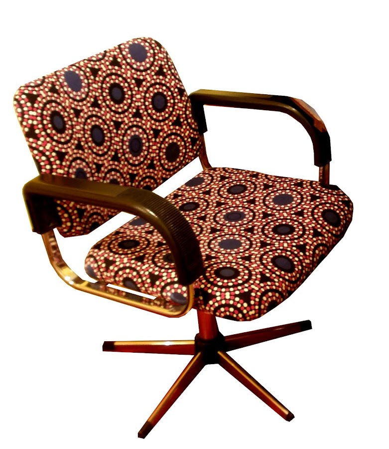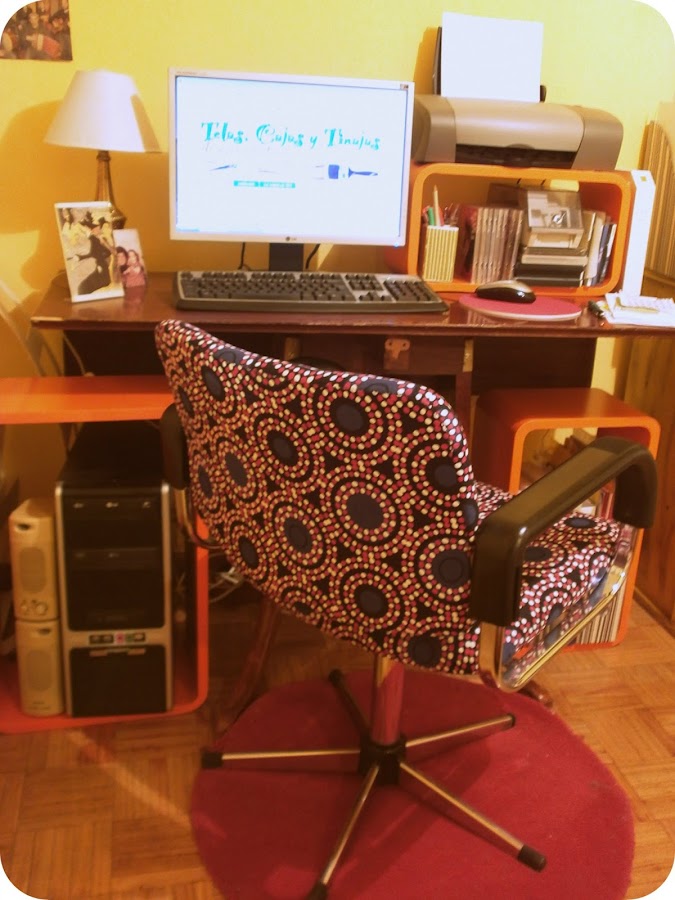 Tapizamos el sillón con una funda de cojín grande super retro que encontramos en una liquidación