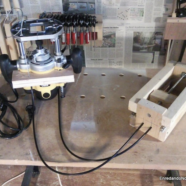 Cuando nos compramos nuestra primera fresadora, la probamos y descubrimos las posibilidades que nos da, nos damos cuenta de que es una máquina que puede llevar nuestro pequeño taller a otro nivel. Después de buscar información en Internet y en Youtube nos damos cuenta de que lo siguiente que queremos es una mesa fresadora. Eso si que nos multiplicará las posibilidades de nuestro taller. Buscamos precios y nos damos cuenta de que suelen costar aún más que la fresadora y alguno no nos la podemos permitir. !Que más da!, un mesa sencilla, un tablero y cuatro tornillos y ya tenemos la mesa fresadora casera. Ahora resulta que si la fresadora no tiene un sistema de regulación de altura incorporado, no resulta sencillo regularla. Y si queremos comprar un sistema de elevación para la fresadora veremos que también cuestan lo suyo, y no estoy seguro de que se puedan acoplar a las fresadoras que no tienen carcasa circular.
