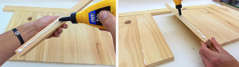 Las ranuras que hayan podido quedar entre las tablas las rellenamos con cola, empujamos con el dedo y limpiamos la superficie.