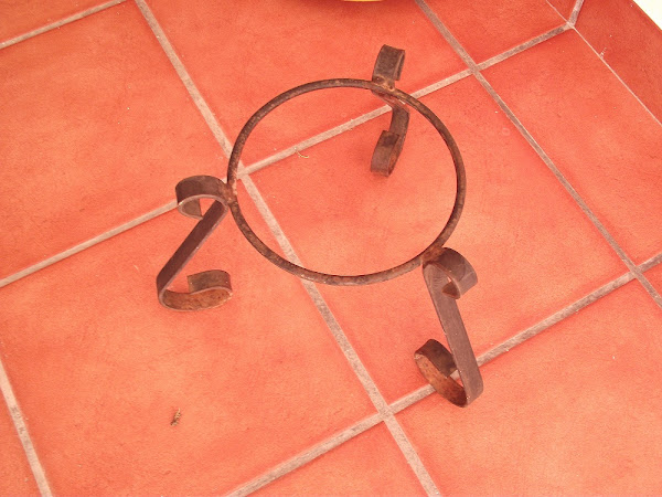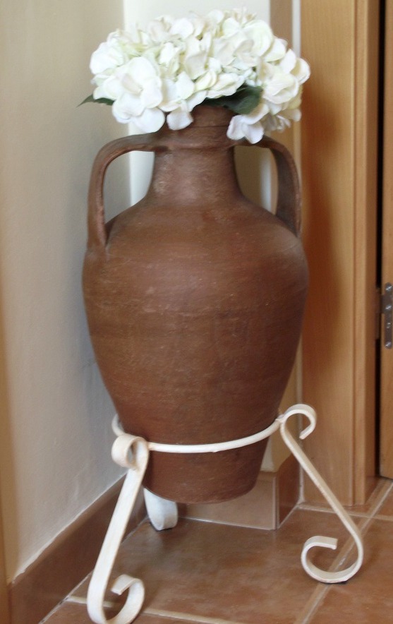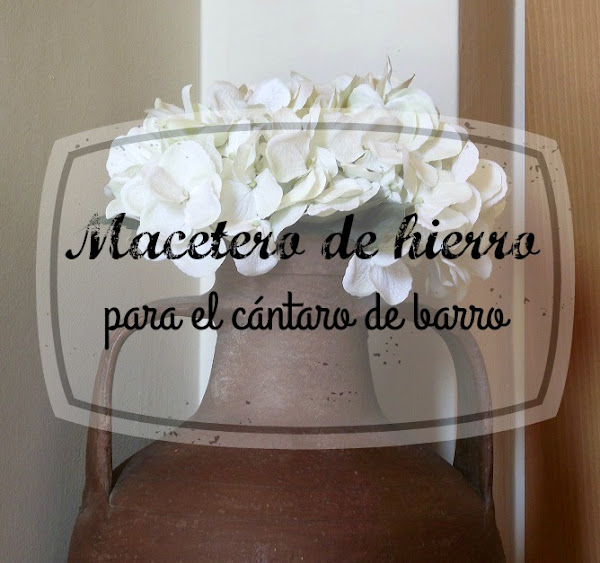 En realidad este soporte de hierro no fue creado para un cántaro sino para una maceta, porque los cántaros no eran objetos de decoración sino útiles de diario, cubrían la necesidad de traer el agua a casa desde el pozo además la mantenían fresca. Al menos éste de las fotos, un cántaro que me regaló mi suegra hace años y que me encanta, mucho más que un cántaro nuevo, porque se ve que realmente ha estado en uso muchos años. Por eso decidí darle un lugar preferente en la casa del pueblo, e izarlo del suelo con el soporte de hierro que os enseño.
