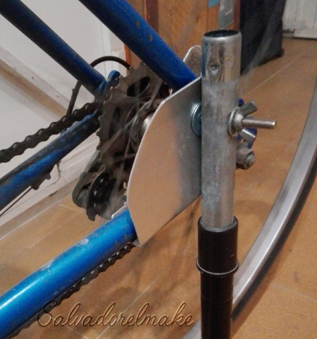 Una tira de 3x8 cm de también de aluminio nos servirá para hacer de mordaza y que luego quede la bici bien sujeta. Todas las piezas se cogen con un tornillo pasante y, para que sea cómodo de poner, una palometa.