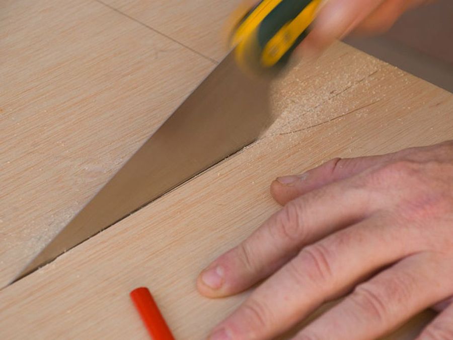 …y comenzamos a cortar, usando nuestra espléndida sierra japonesa. Siempre que es posible, efectuamos los cortes a mano, que resultan fáciles en contrachapados de hasta 15 mm de grosor.