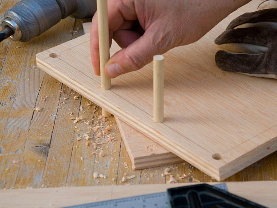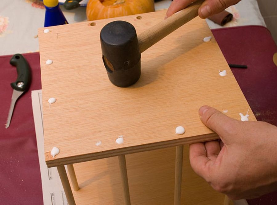 Echamos cola de carpintero en cada agujero, y ajustamos ambas tablas usando el martillo de goma de albañilería. Lo haremos por ambos lados. Es la manera más sencilla de encolar el extremo de los barrotes para dar solidez a la estructura.