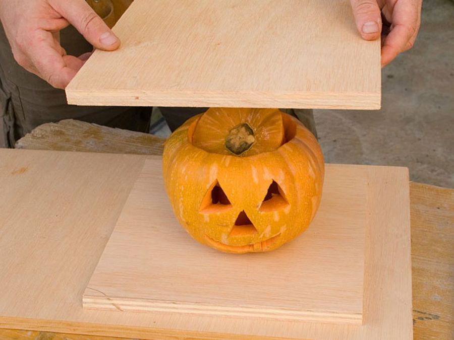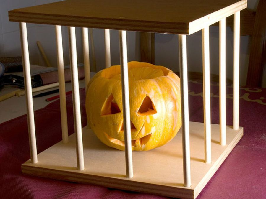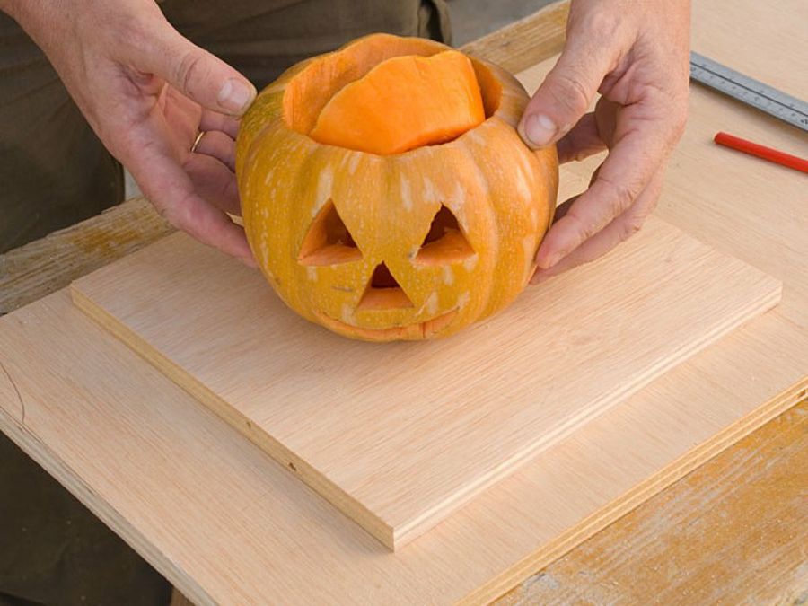 Colgaremos nuestra calabaza de Halloween en una jaula a su medida, y enteramente de madera tal como se hacían en el Medievo. Hemos escogido para la base y el techo un tablero contrachapado de 15 mm. Presentamos la calabaza, marcamos con la escuadra...