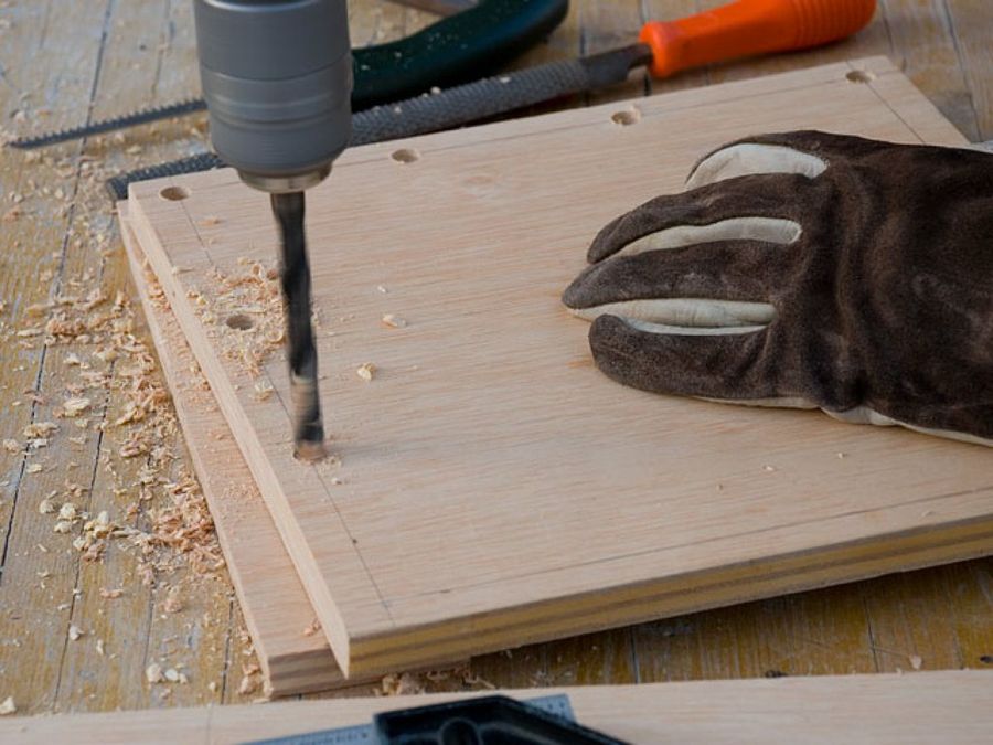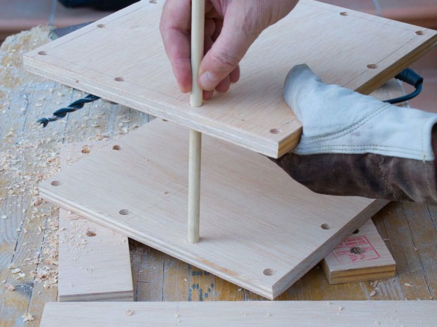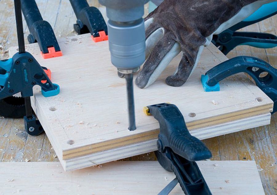 Tras hacer los preparativos en la primera tabla, la fijamos como una plantilla a la segunda con pinzas de resorte, y de esa manera sencilla coincidirán los agujeros de la base y el techo.