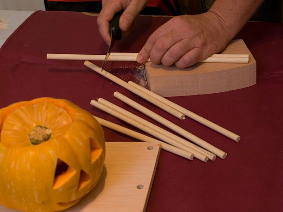 En esta posición haremos el montaje con toda comodidad. Unimos las dos tablas con las varillas, pero sin llegar a encajarlas del todo, y dejaremos abierto uno de los lados para que nuestra calabaza pueda entrar y salir sin impedimentos.