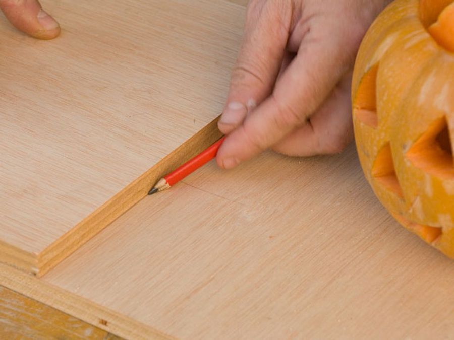 Y ahora sencillamente obtendremos la tabla del techo utilizando la primera. Hacemos la marca con el lápiz de carpintero, bajo la atenta mirada de nuestra calabaza.