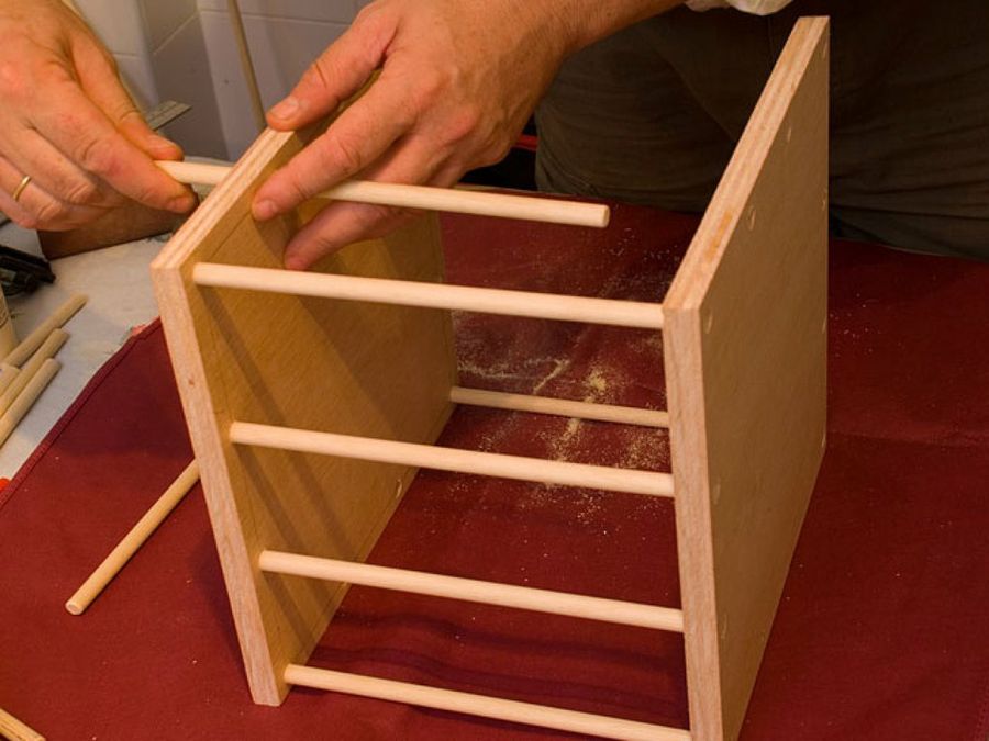 Después de verificar que los barrotes pasan bien por los agujeros, completamos el perímetro de la celda de madera. Pondremos cuatro barrotes por cada lado.