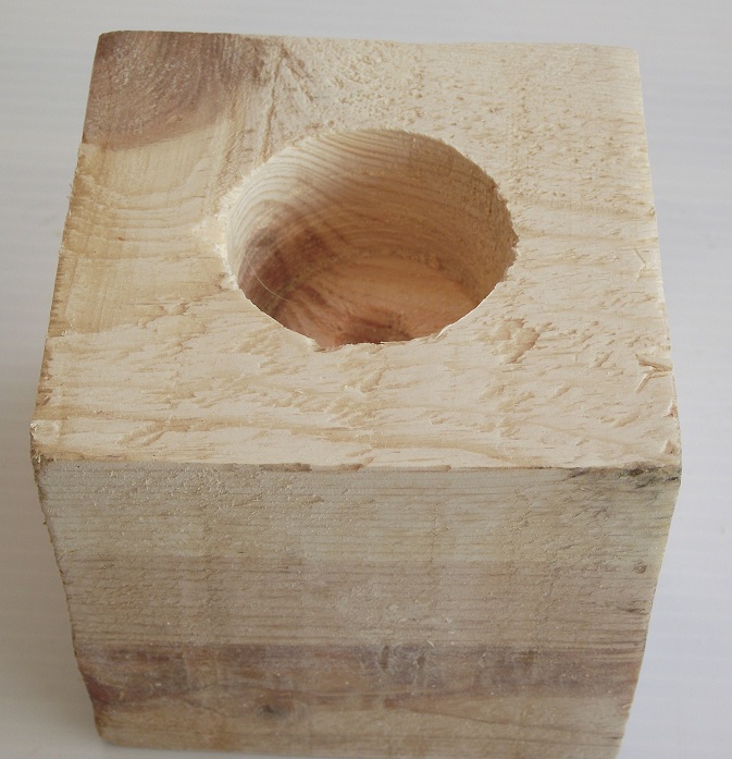 El proceso para elaborarlo es muy sencillo: una vez hecho el hueco para la vela (y si en el intento no nos hemos llevado las manos o la cabeza antes de comprender que lo tenemos que sujetar con sargentos) lo teñimos y pintamos con el color claro y con una brocha ancha, dejando que el color de la madera se vea por distintos sitios, sin cubrir demasiado con la pintura.