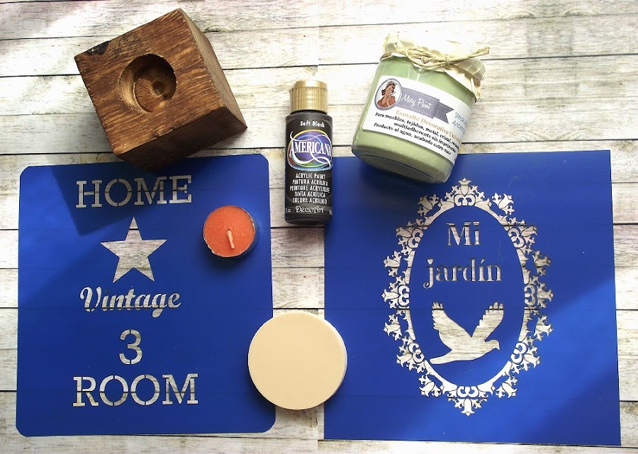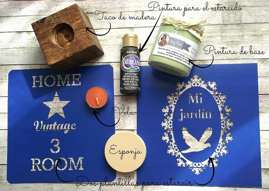 El kit consta de lo siguiente: un taco de madera de palé lijado, teñido y con tapaporos, listo para ser decorado (vamos, con el trabajo duro ya hecho jaja); un bote de pintura Mary Paint color verde antiguo; un bote de pintura acrílica Americana color negro suave para hacer los estarcidos; dos plantillas para estarcir diseñadas por mí y que pondré a la venta próximamente (síii, ese era el proyecto del que os hablé la semana pasada) y una esponjita de las que yo uso para estarcir. Y por supuesto la vela para que realmente sea un portavelas.