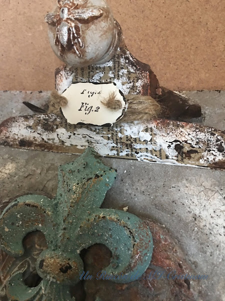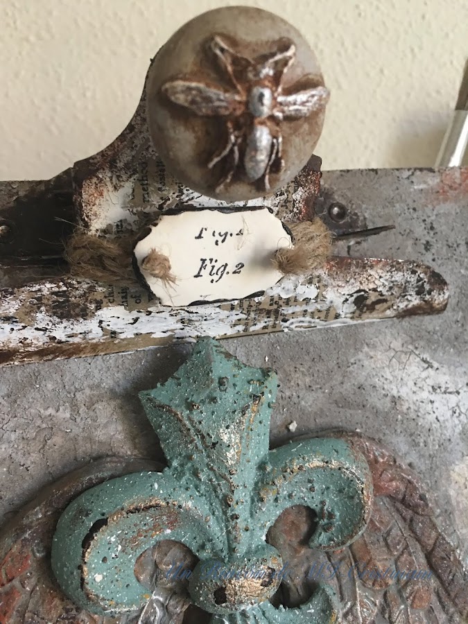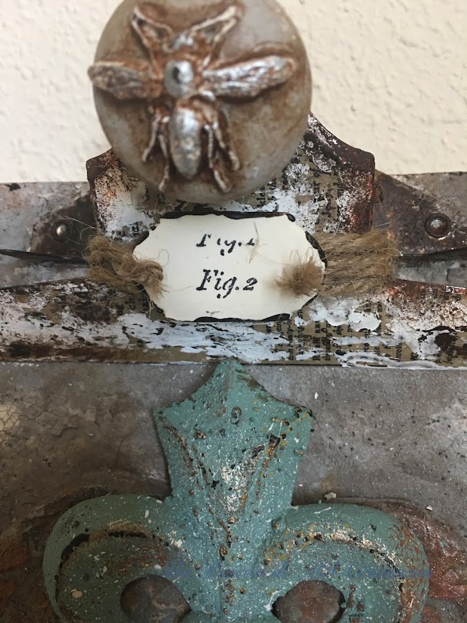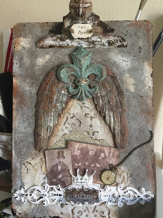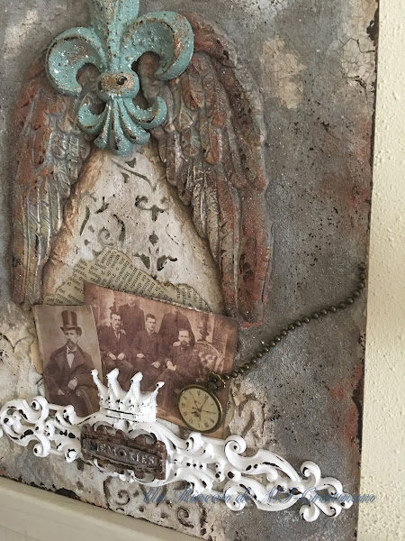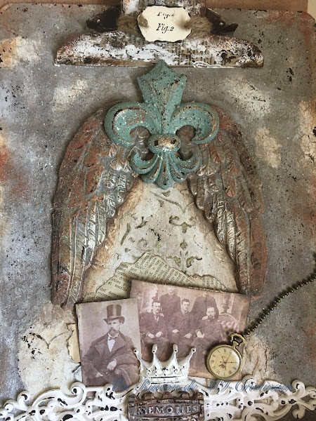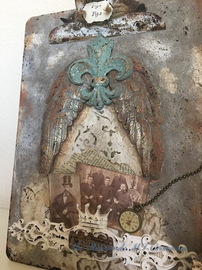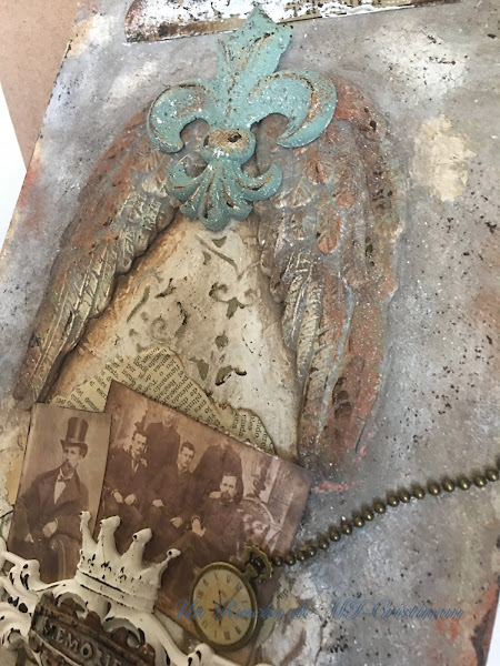 Se me olvida hablar de la figura principal y que esta compuesta por unas alas decoradas con la técnica del oxido y las pinturas vintage legend que os mostré en otra entrada de este blog....