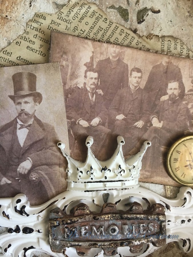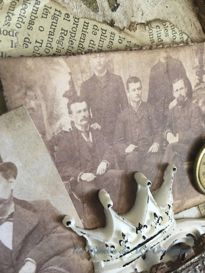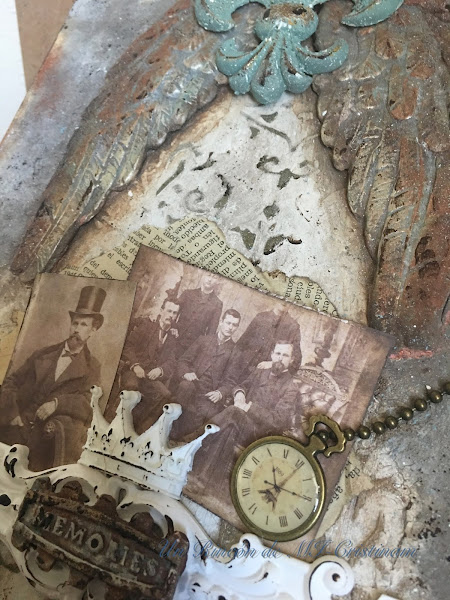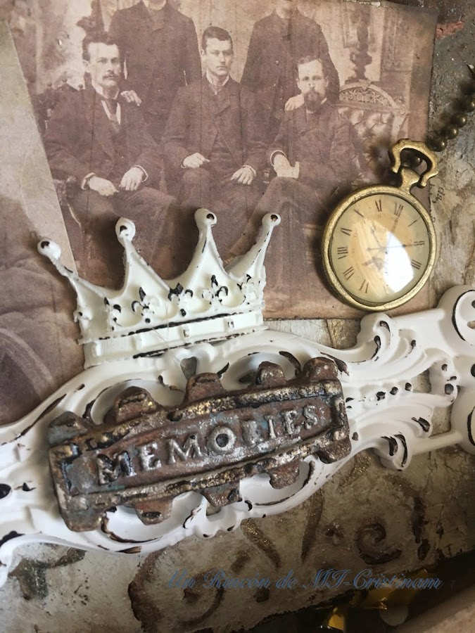 También he usado detalles metálicos como son el reloj y la chapa de Memories que luego he pintado con tonos marrones y ceras de colores.