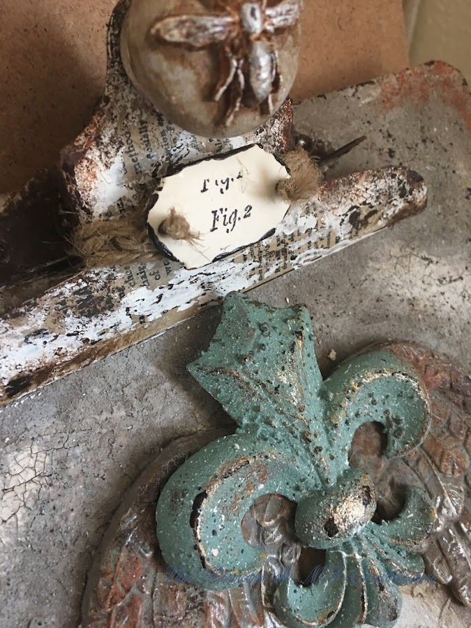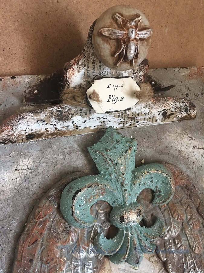 El fondo esta lleno de texturas conseguidas con pasta craqueladora y encima pinturas vintage legend de la marca Cadence que yo obtengo en El Niu del Lart-pinturas vintage legend
