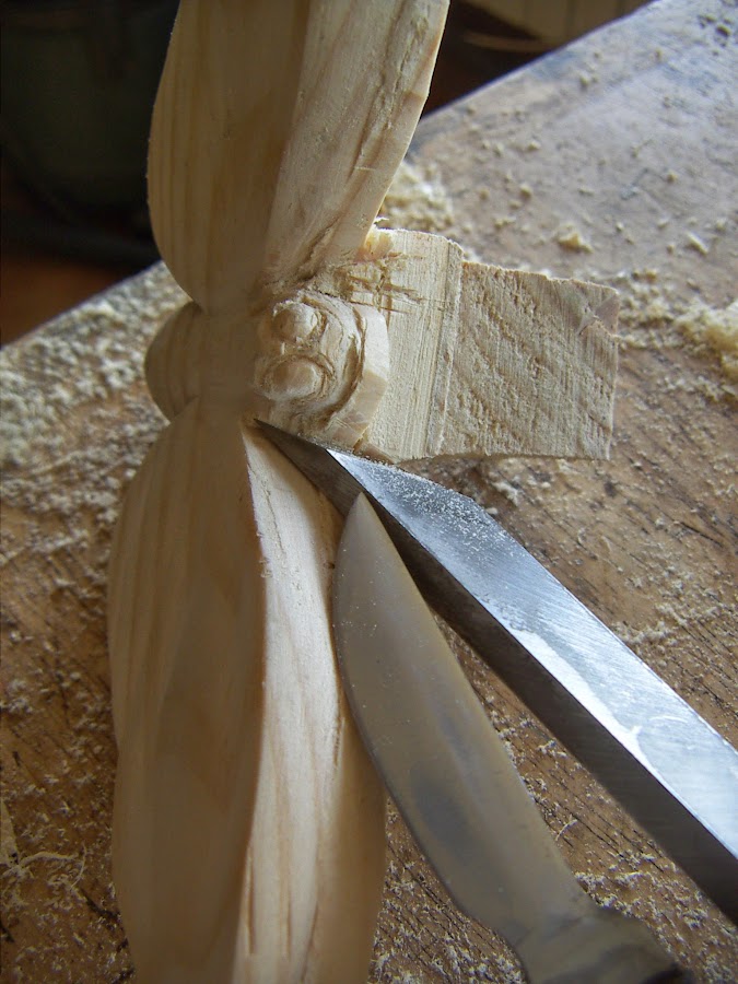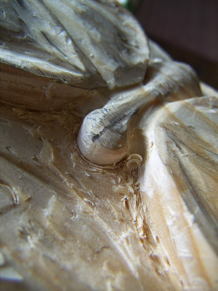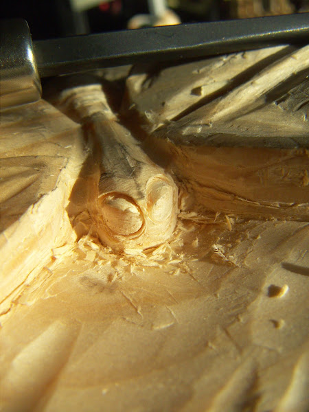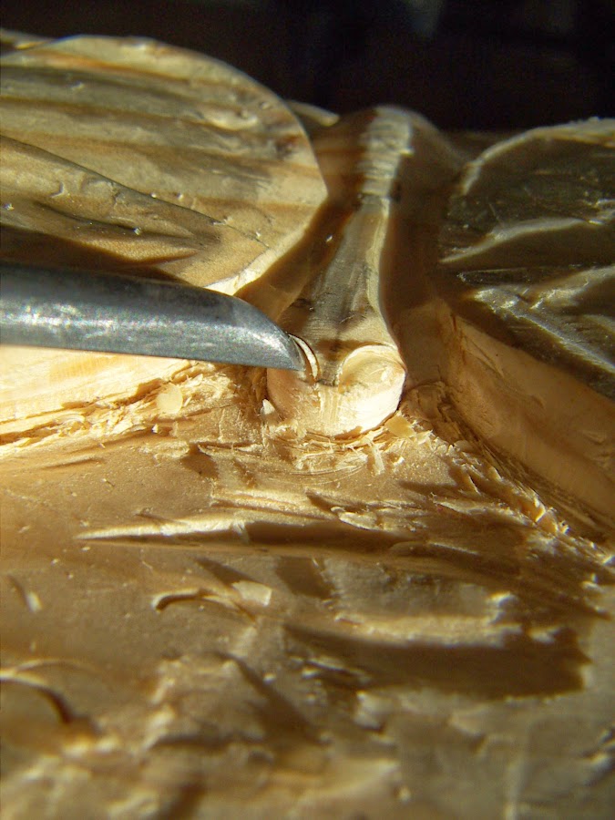 ..y luego hacer otros un poco más abajo para ir dándole forma a los ojo haciendo , claro está un circulo completo. Como vi que ya me habían salido algo torcidos y, tallarlos así, sin eliminar el resto de la madera era algo complicado...los dejé para más tarde..
