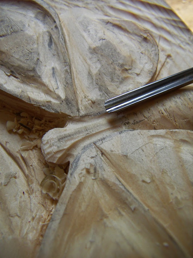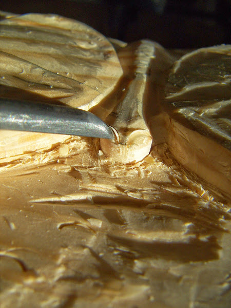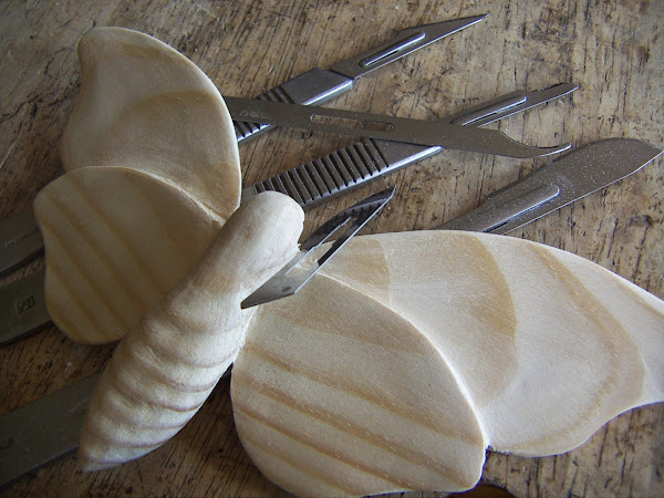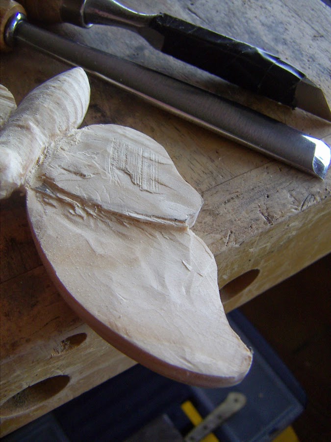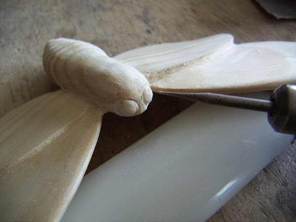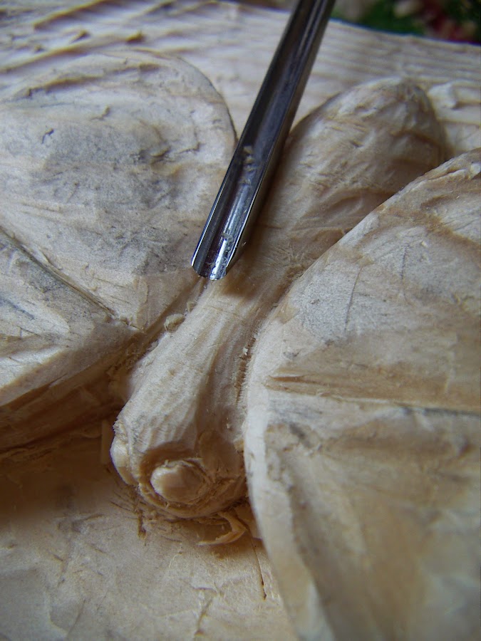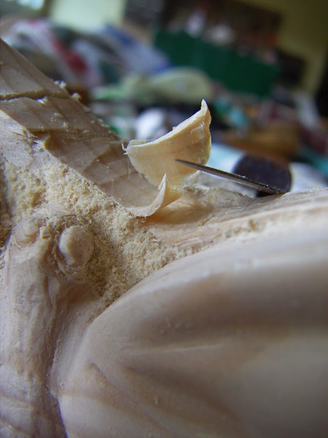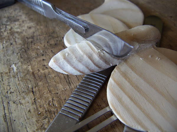 Trazo unas líneas muy superficiales en el cuerpo para dejarlo algo rugoso y ahora le daré la forma definitiva a las alas a base de lija, porque por este lado ya no volveré a utilizar las gubias.