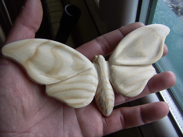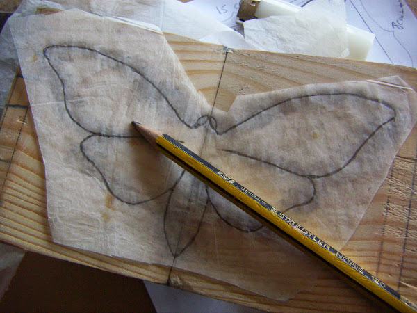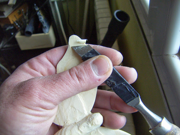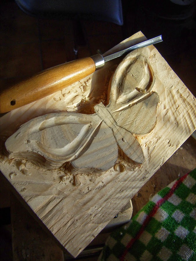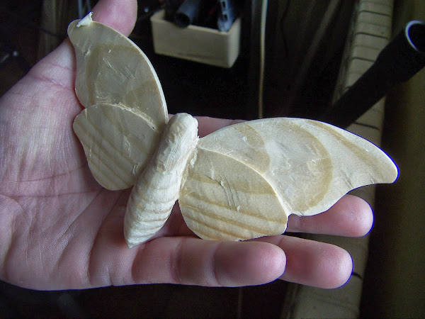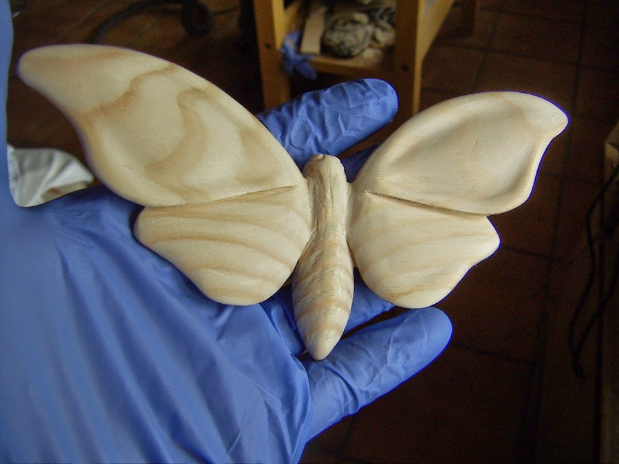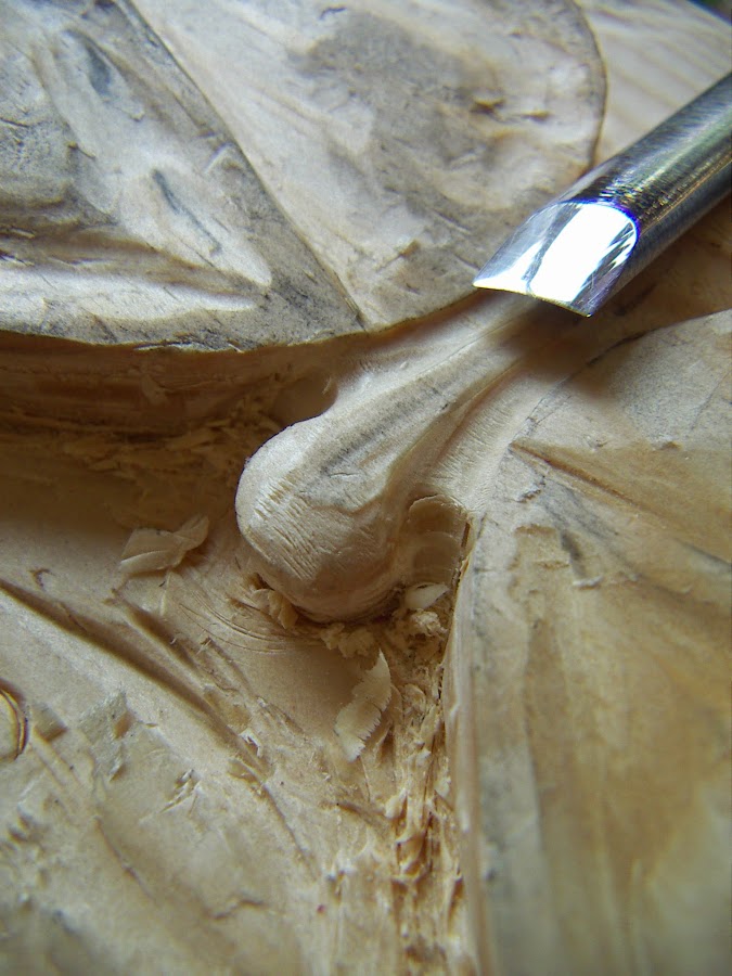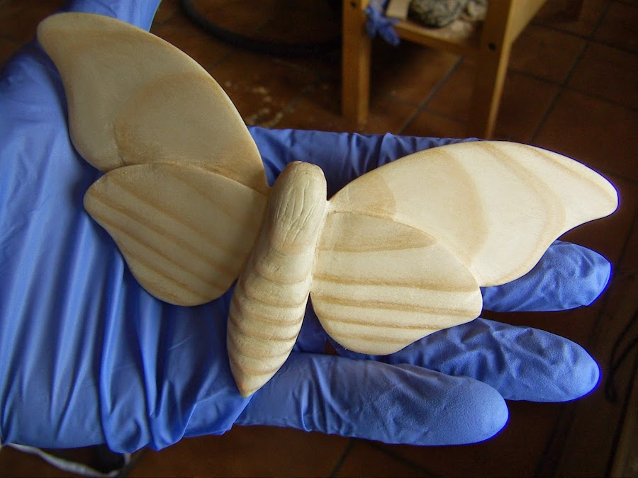 Trazo unas líneas muy superficiales en el cuerpo para dejarlo algo rugoso y ahora le daré la forma definitiva a las alas a base de lija, porque por este lado ya no volveré a utilizar las gubias.