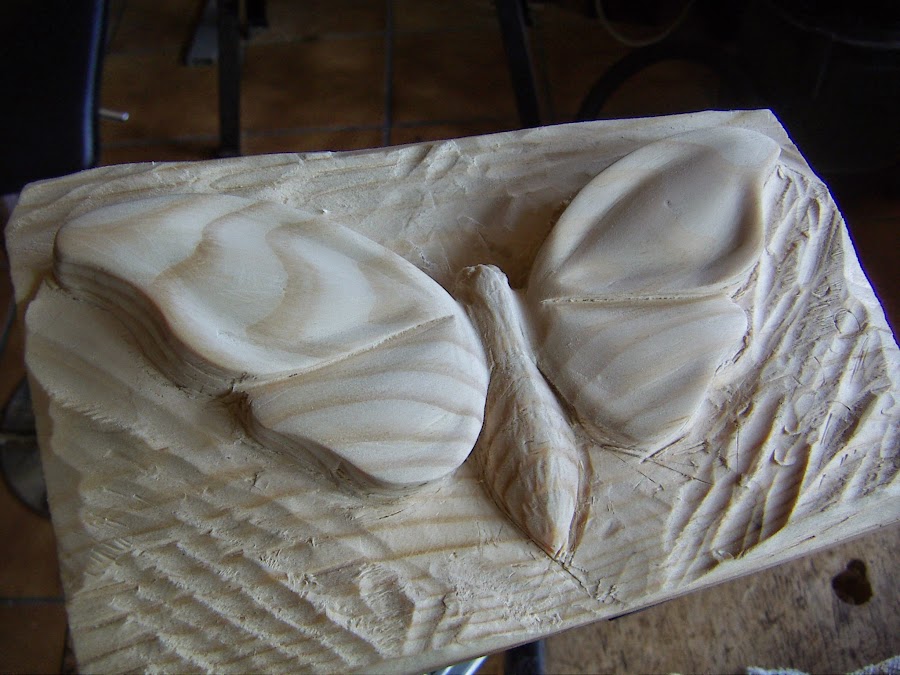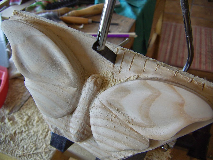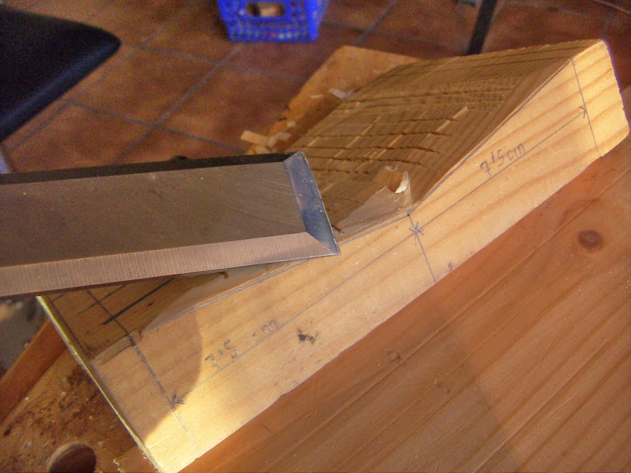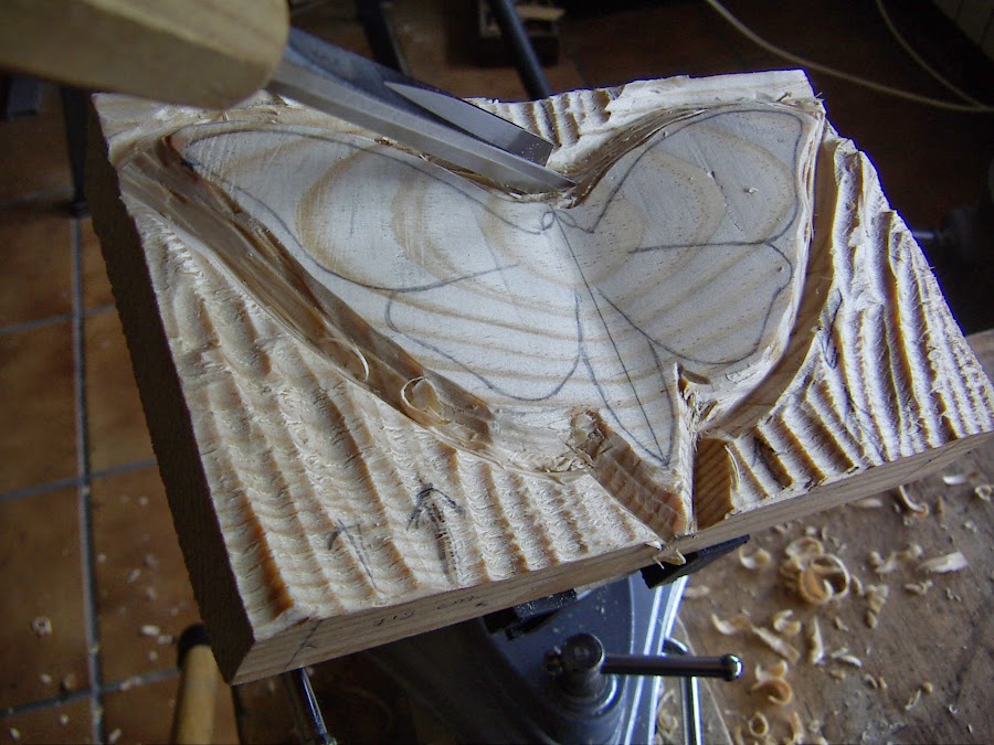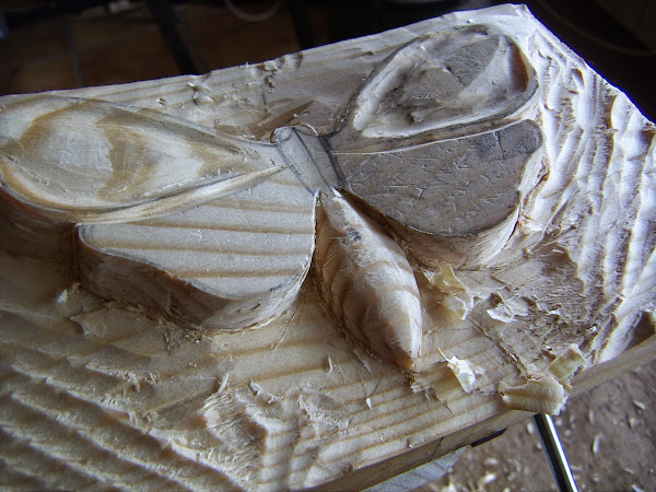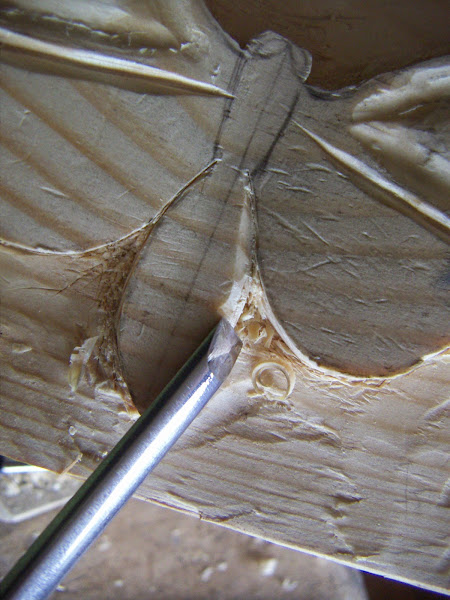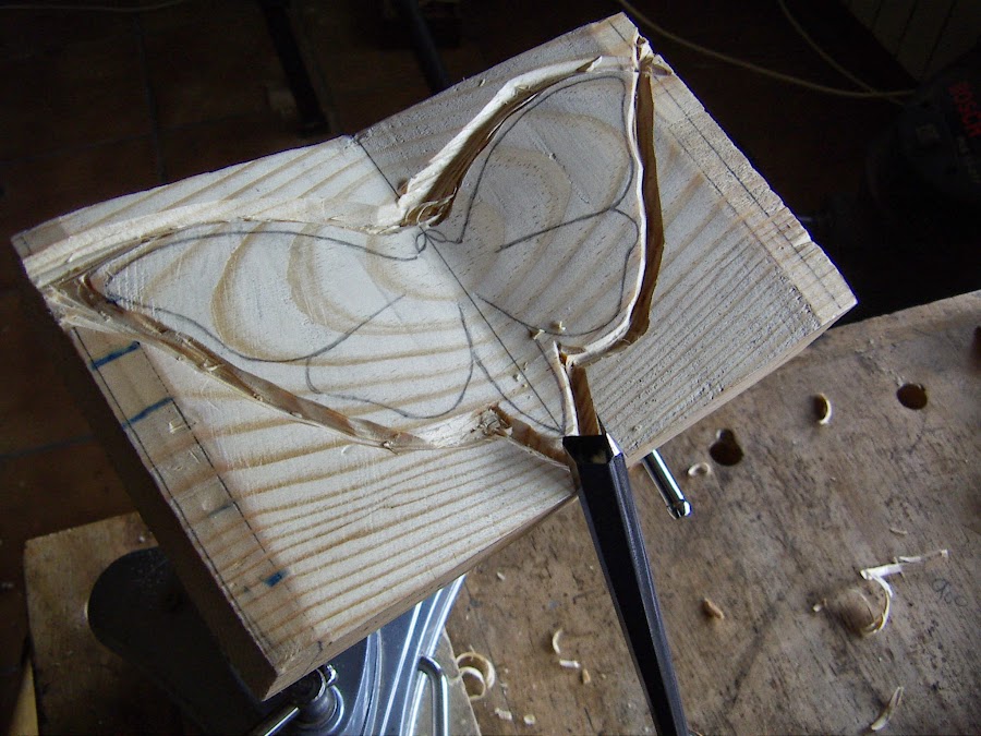 ..y comienzo a desbastar con una gubia de media caña o a eliminar la madera sobrante, hasta una profundidad un poco mayor que el grosor final que tendrá la polilla.Siempre es mejor que nos sobre madera que no quedarnos cortos...