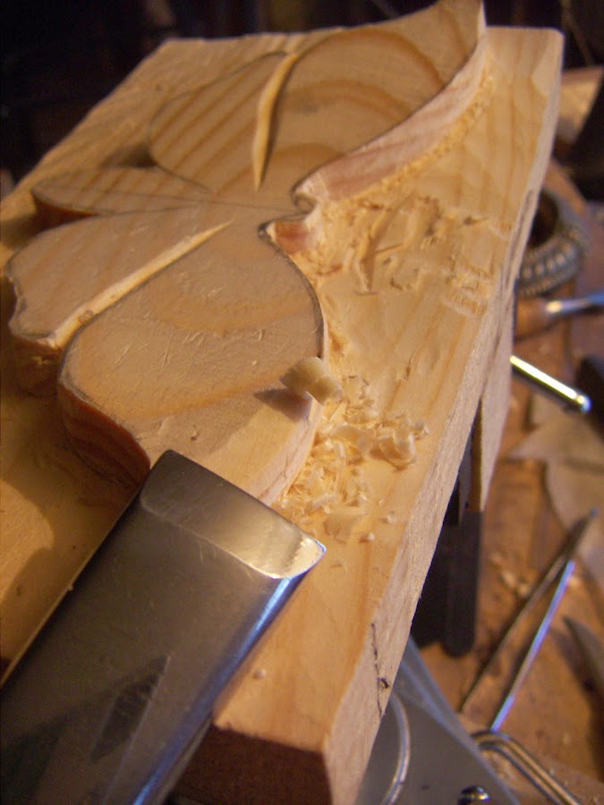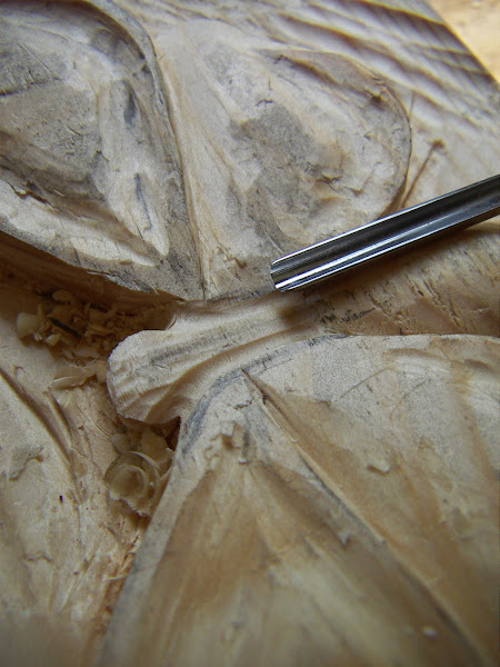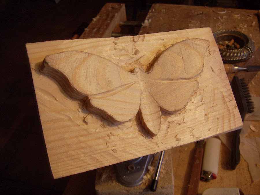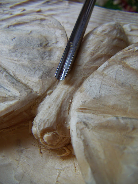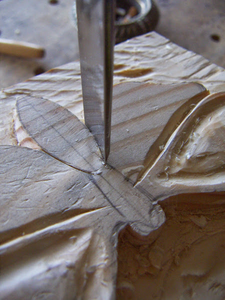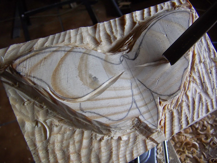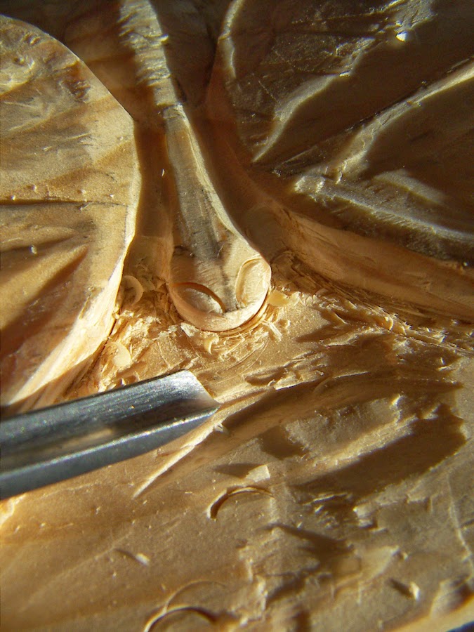 ..y comienzo a desbastar con una gubia de media caña o a eliminar la madera sobrante, hasta una profundidad un poco mayor que el grosor final que tendrá la polilla.Siempre es mejor que nos sobre madera que no quedarnos cortos...