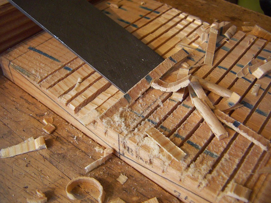 Otra forma de rebajar la madera sería serrándola directamente por las líneas, pero por el tamaño es algo incómodo...o, utilizando unas escofinas, empezando con una gruesa y terminando con una más fina...