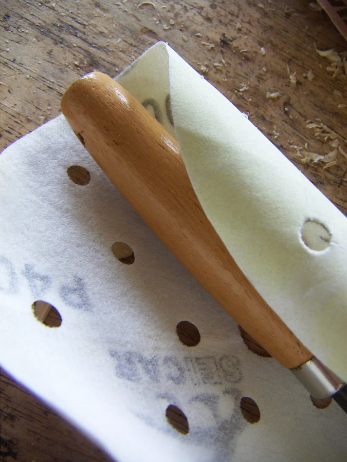Cuando queremos dejar una superficie muy lisa en una madera con mucha veta, como es el caso, es conveniente envolver la lija en algo consistente que se adapte a las formas porque hay mucha diferencia de dureza entre la veta y el resto de la madera y si lijamos sólo con los dedos, se nos quedará marcada la veta quedando más alta.