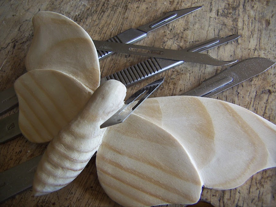 ..y ahora, como toque final, a mi me gusta mucho utilizar cuchillas con la madera. Cuando son piezas grandes uso las de ebanista pero con algo tan pequeño como esto, usé estas hojas de bisturí, con cuidado t siempre en el sentido de la veta a no ser....