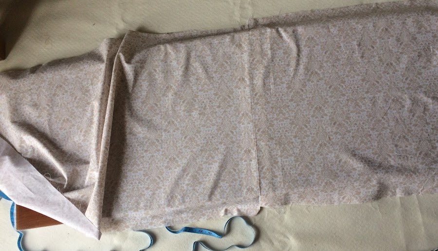 Como mi tela era más estrecha que el cabecero, lo que hago es una costura justo en el centro del cabecero, pero tener en cuenta que si tiene dibujo, como es el caso, debo casar muy bien el dibujo para que no se note y parezca una única tela. En esta foto podéis ver como queda mi costura.