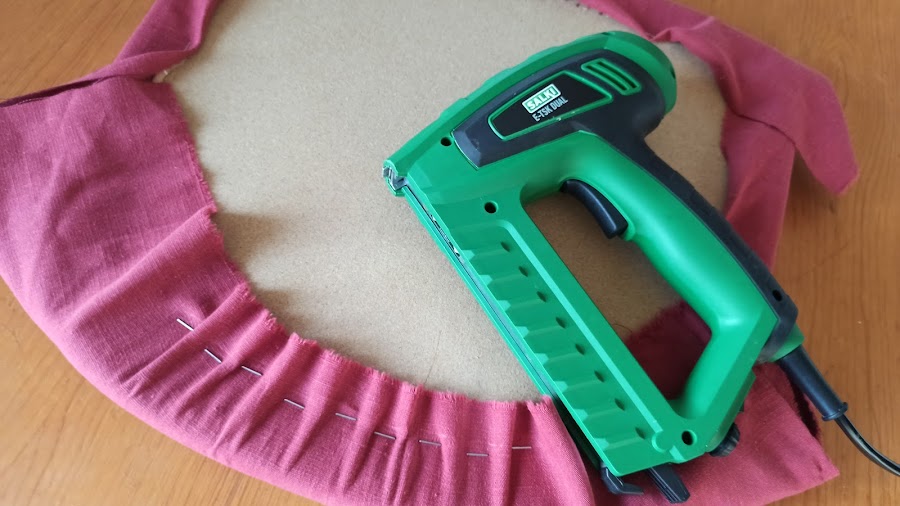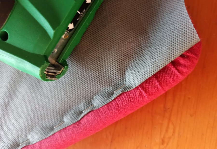 Primero grapar la tela en cruz en los cuatro centros, para luego ir ajustando y grapando hacia las esquinas. siempre evitando que queden arrugas a la vista. Tanto encima como en los laterales.