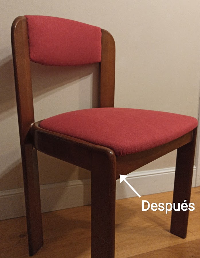 Comencé por soltar las dos piezas de la silla. Asiento y respaldo. Estaban unidas por tirafondos y en el caso del respaldo por tubillones.