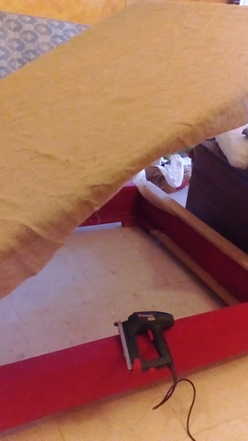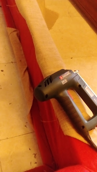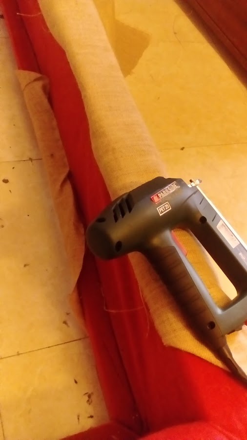 Primero se calcula y se corta la tela, y empiezo por la parte de arriba, que es mas fácil. Se tiene que empezar grapando en medio de los cuatro lados, en forma de cruz, esto es muy importante para que no se nos mueva la tela, y para llevar los defectos y arrugas hacia las esquinas. Vamos grapando del medio a los extremos, o de dentro a fuera. Vamos tensando un poco la tela.