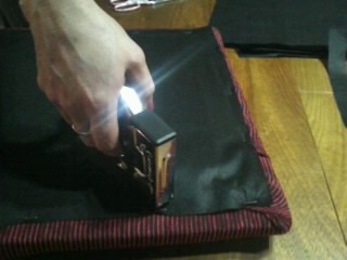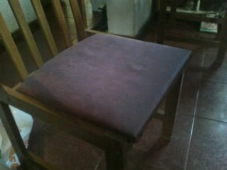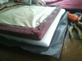 Sobre la mesa pusimos la tela del revés, cuadrado doble de Polyfom para darle altura y sobre todo esto, el asiento. El siguiente paso es envolver el paquete con la tela tapicera y engrapar dejando la tela lo más tirante posible.