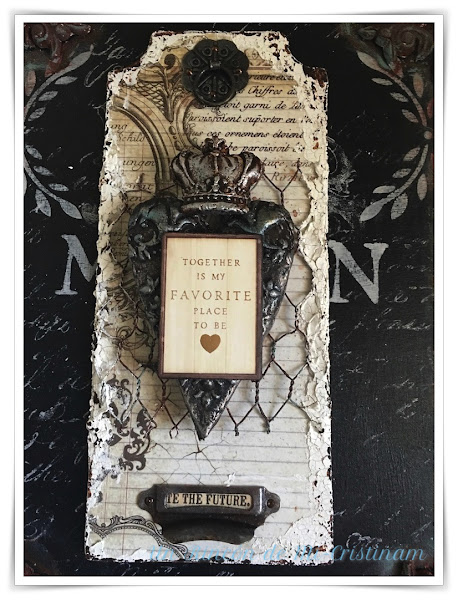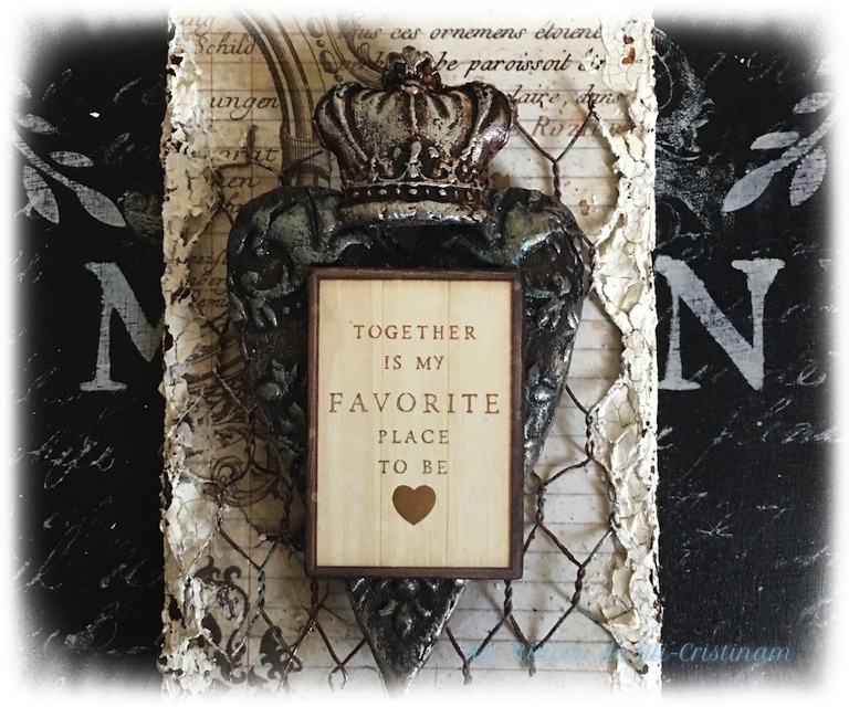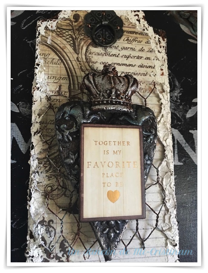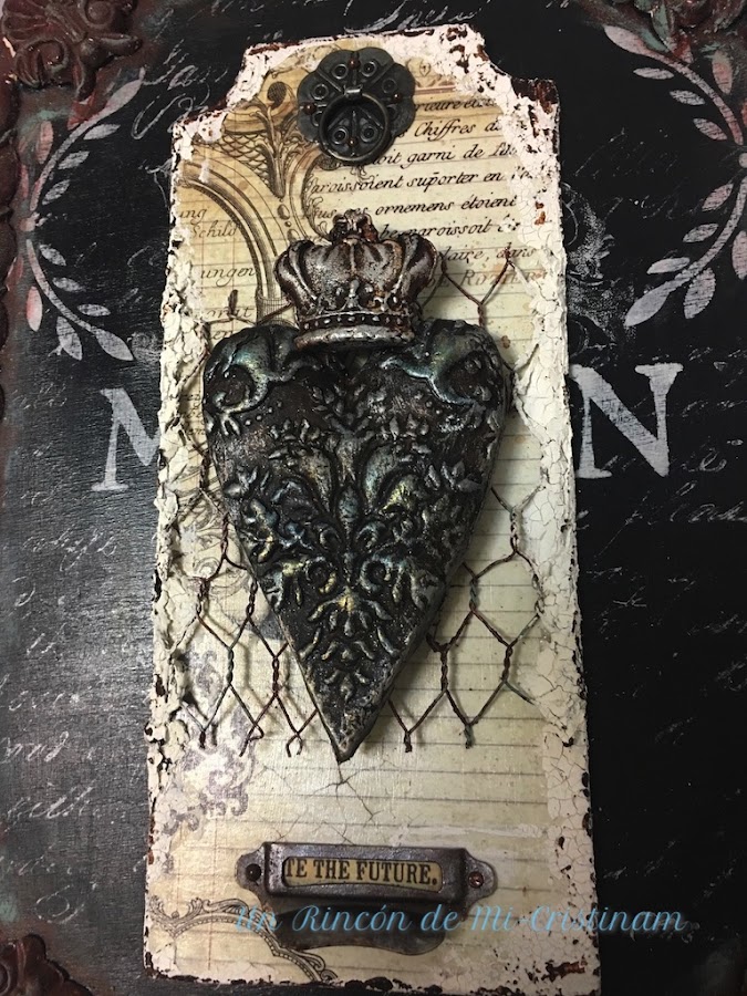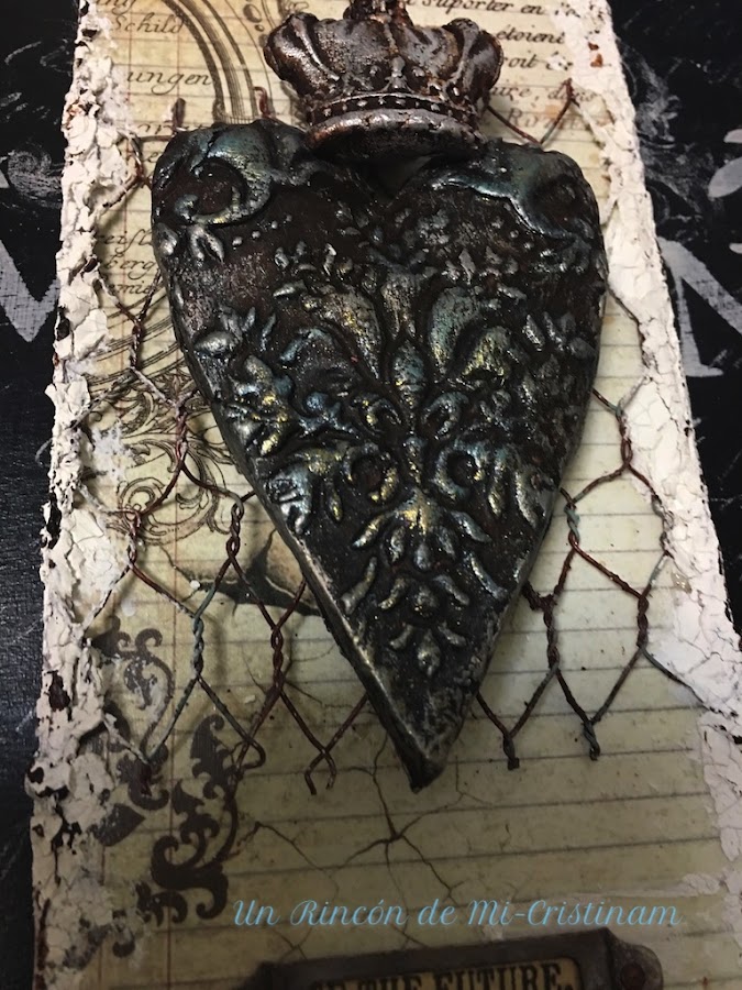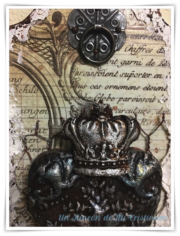 He sacado del armario de los trastos esta coronita que al ser mas pequeña queda mejor sobre el corazón... lleva color de base marrón ,cera plateada y pintura Dora Metallic oxido Gold