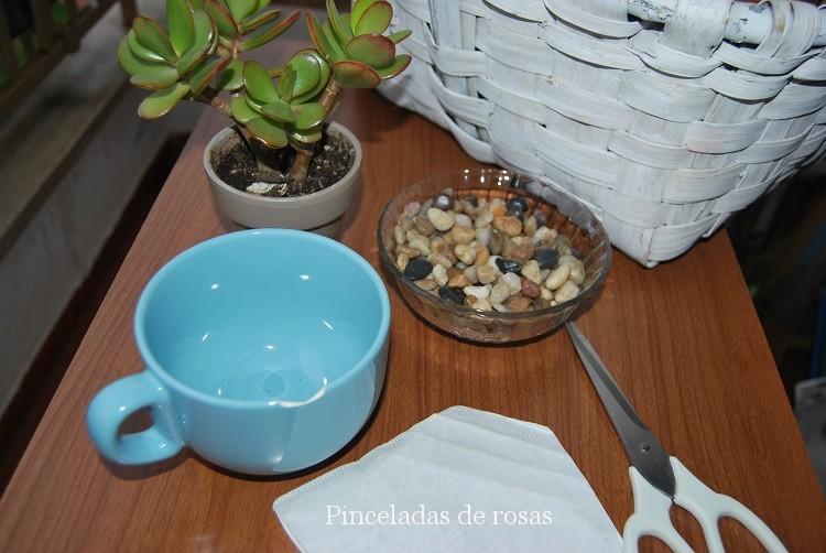 Tazón o taza, piedras pequeñas o medianas, filtros de café, tijeras, tierra y la planta a trasplantar