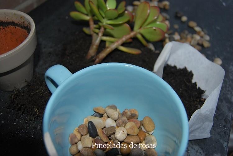 Ponemos las piedras en el fondo de recipiente, ponemos la tierra sobre el filtro de café y lo acoplamos sobre las piedras a continuación colocamos la planta aplastamos la tierra y centramos bien la planta, cortamos el sobrante del papel que sobresalga del recipiente y ya tenemos la plantita en su nuevo soporte.