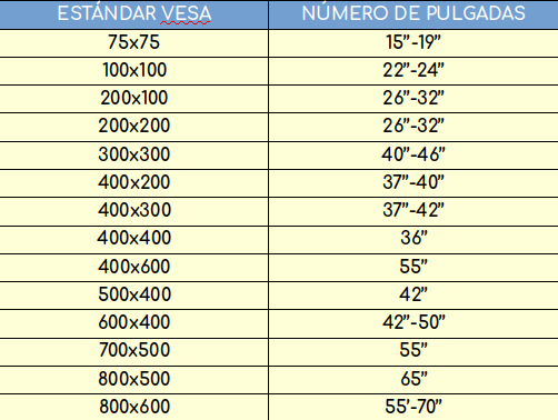 Para que os podáis hacer a una idea, esta sería, aproximadamente, una relación entre la medida del estándar VESA y el tamaño de los televisores: