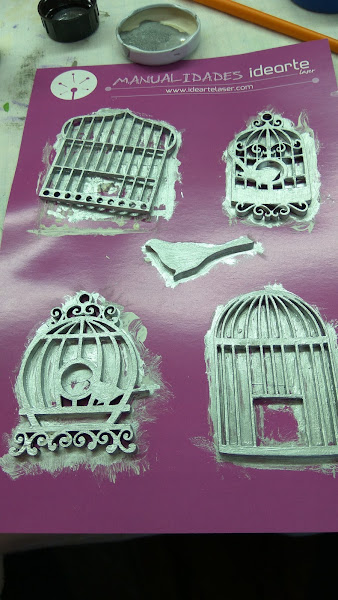 Primero pinté unas siluetas de madera (jaulas y pájaro) con blanco roto en la capa de base y después pintura plateada al disolvente por encima.