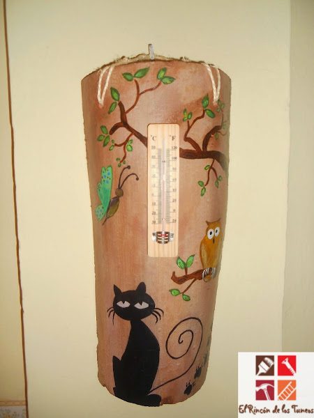 Tengo otra teja nueva ya lista y acabada para enseñaros, esta vez no sólo la he pintado sino que la he añadido un termómetro para ponerla en la entrada de la casa y así saber la temperatura. Os digo que he utilizado: - Una teja antigua - Acrílicas: he utilizado un color marrón chocolate de fondo - Plantillas de stencil una de una rana y otra plantilla con las florecitas. - Pinceles stencil (y si ...