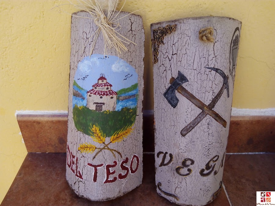 Dos tejas pequeñas para dos apellidos hechos para una pareja, con dibujos hechos a mano alzada significativos del lugar de procedencia de cada uno de ellos, Zamora y Palencia.