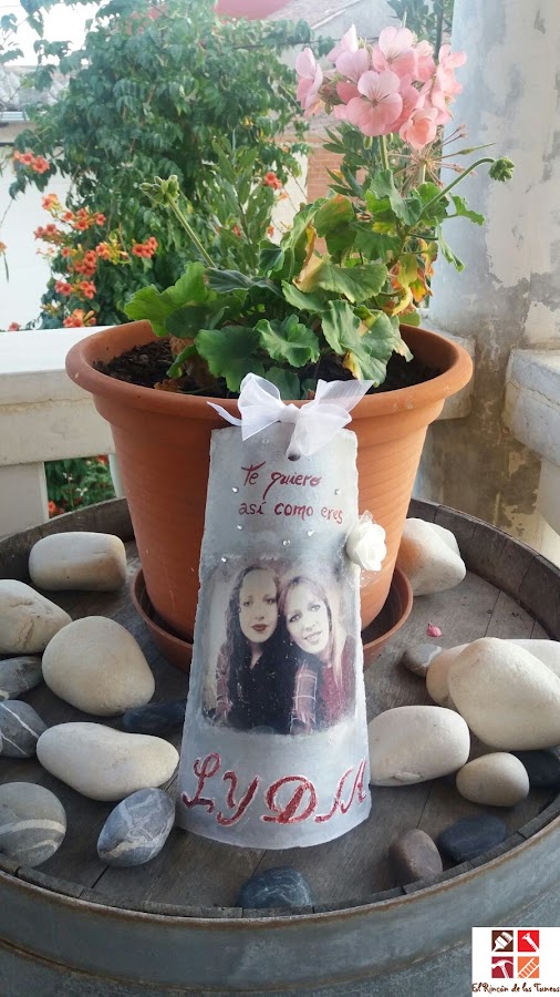 Pintada a mano, con transfer de una foto especial y adornos decorativos.