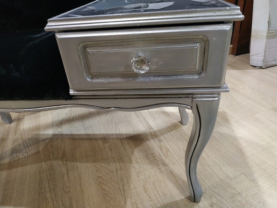 Por último coloco remate y forro sobre y cajón con papel de pared de textura terciopelo con tonalidades plata dándole ese toque atrevido que la hace espectacular, poniendo como broche final un tirador efecto diamante.
