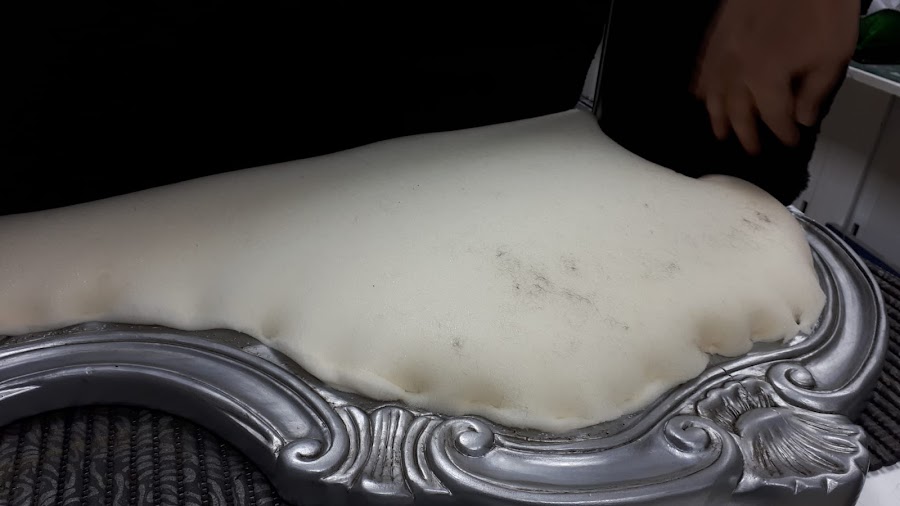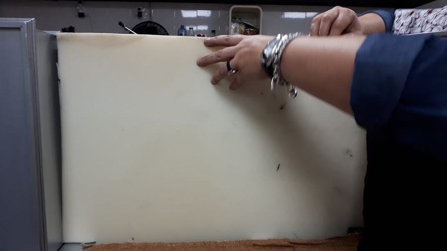 Una vez pintada la estructura y tensadas las cintas del asiento empiezo a cortar las piezas de espuma y telas nuevas usando las viejas como patrón.