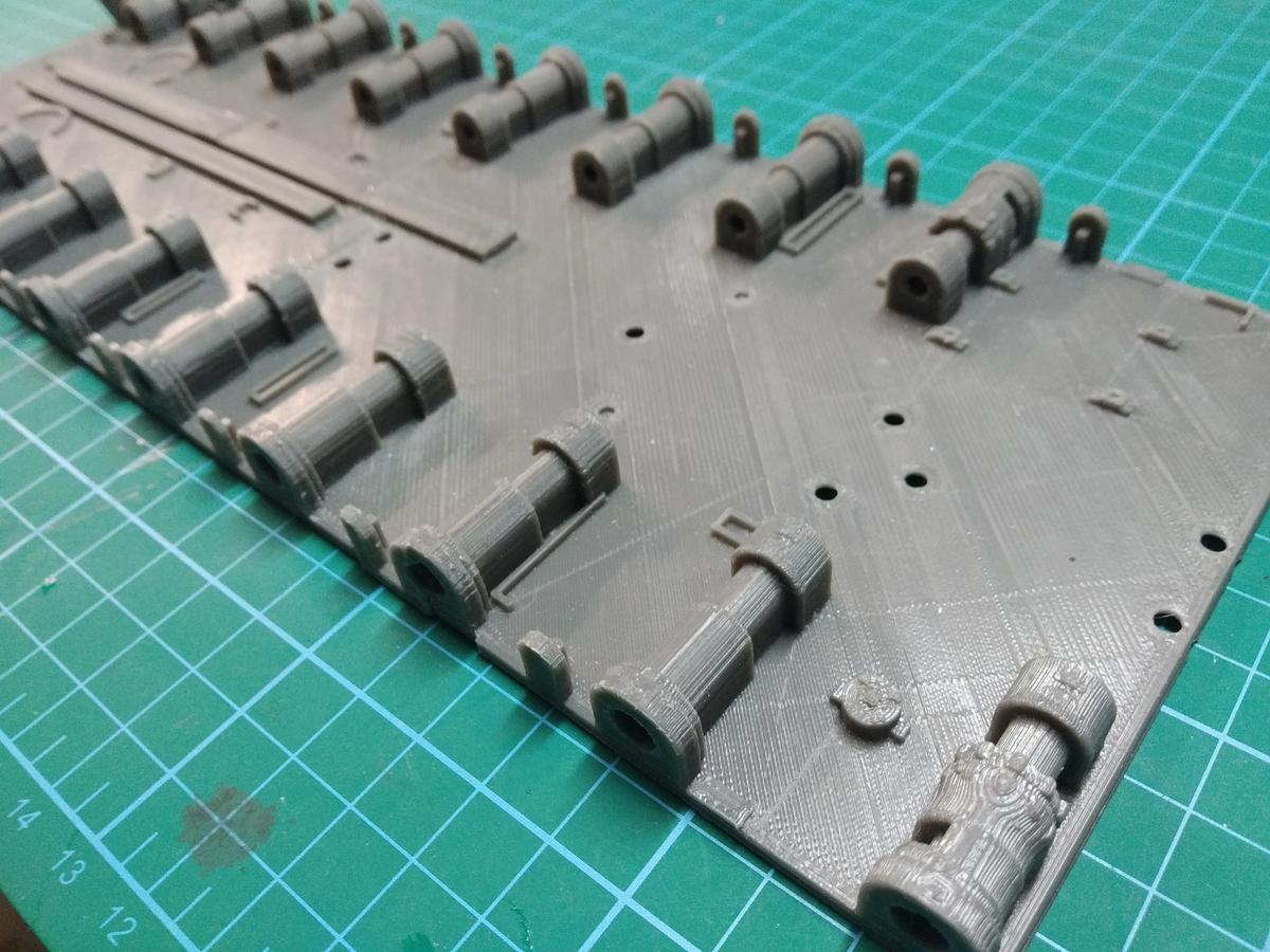 Hay muchas piezas que van a tener ciertos detalles que al colocarlas en la cama, necesitaran soportes. Lo cual creara una superficie irregular, donde se marcaran mucho las líneas de impresión. Esto lo solucionaré masillando a continuación. Podría eliminar esos detalles pequeños, para hacer la impresión mas sencilla, y copiar la superficie de la cama, pero se trata de marcas para el pegado posterior de otras piezas, y prefiero tener esas referencias impresas. Una vez masillado, y aplicada la pintura, no tiene porque quedar mal.