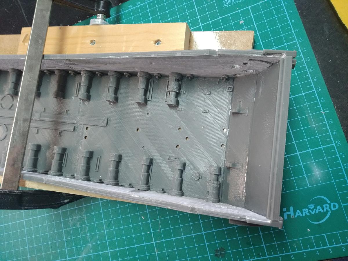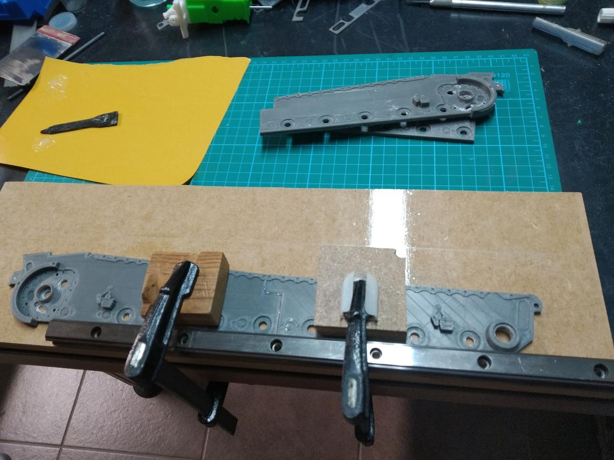 El pegado lo voy a realizar (al menos las partes mas importantes) con pegamento de epoxy (bicomponente). Utilizare bases o potros para el pegado, para garantizar la planitud de la unión de piezas.
