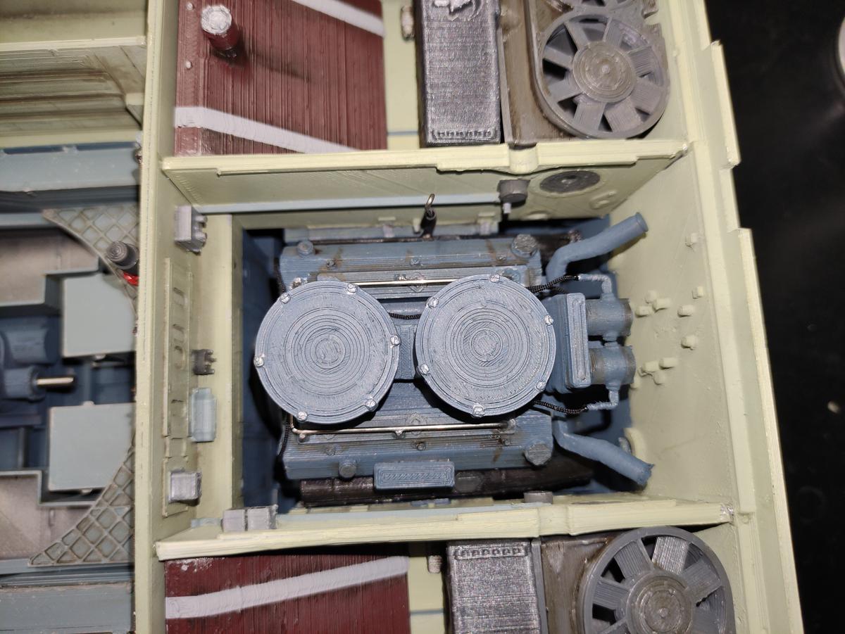Aqui os muestro detalles del chasis vacío ya pintado y con todo el sistema de tracción, y las tuberías del sistema de engrase de los cojinetes.