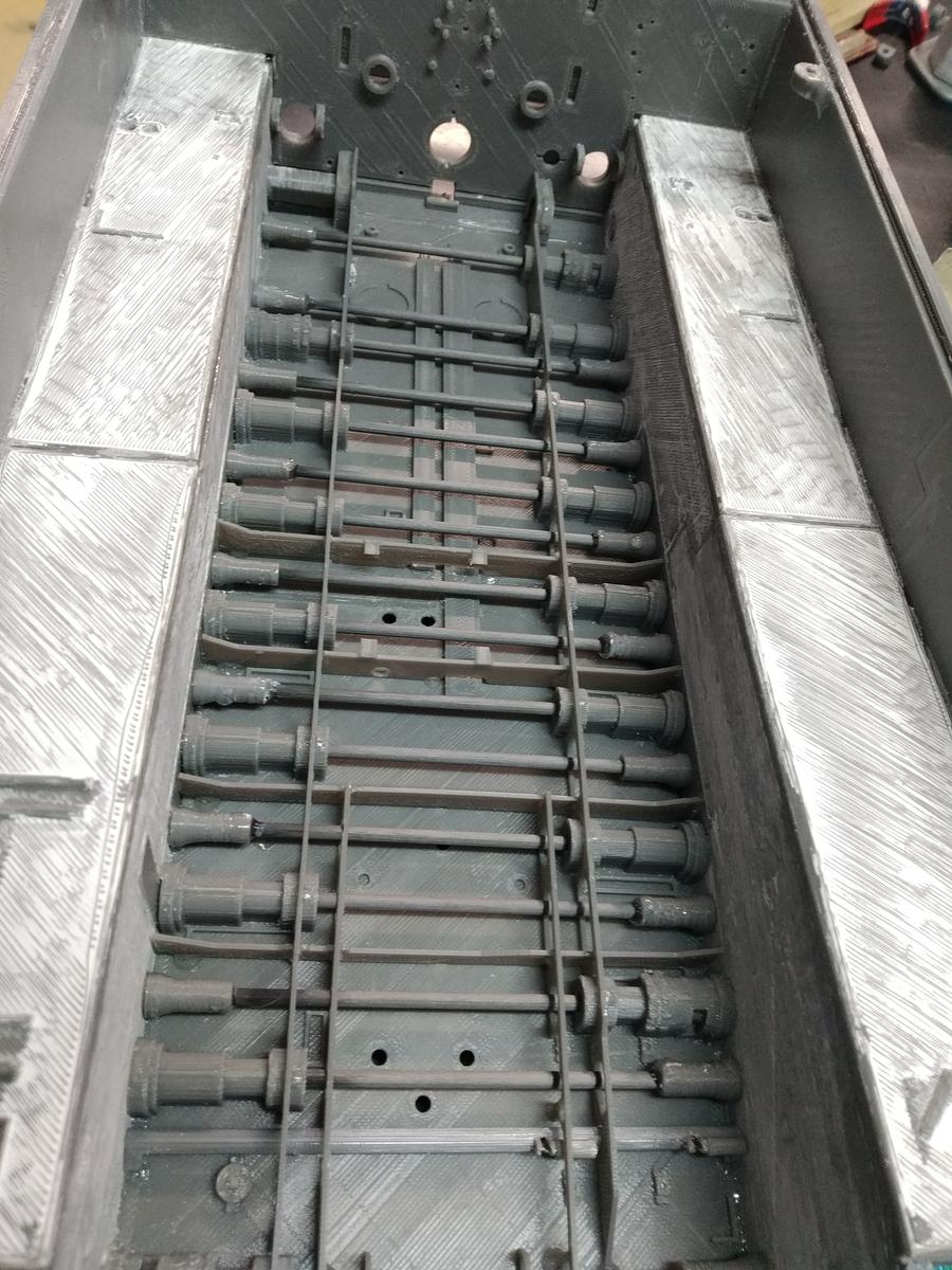 Como he explicado antes, la suspensión de este tanque se basa en las barras de torsión. En la realidad se trata de barras redondas de metal, de una longitud considerable, que cruzan el tanque de lado a lado. Están sujetas fijas al chasis en un extremo y en el otro giran con unos rodamientos. El brazo que sujeta la rueda, puede pivotar retorciendo esta barra, que aprovecha la elasticidad del metal para hacer la función de muelle, y conseguir la recuperación de una deformación por el terreno.