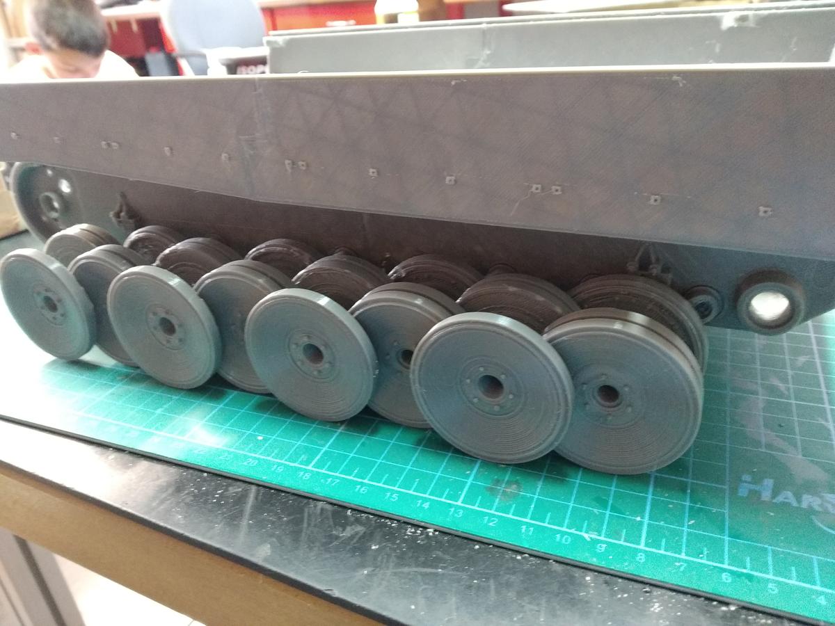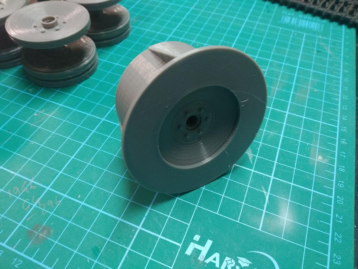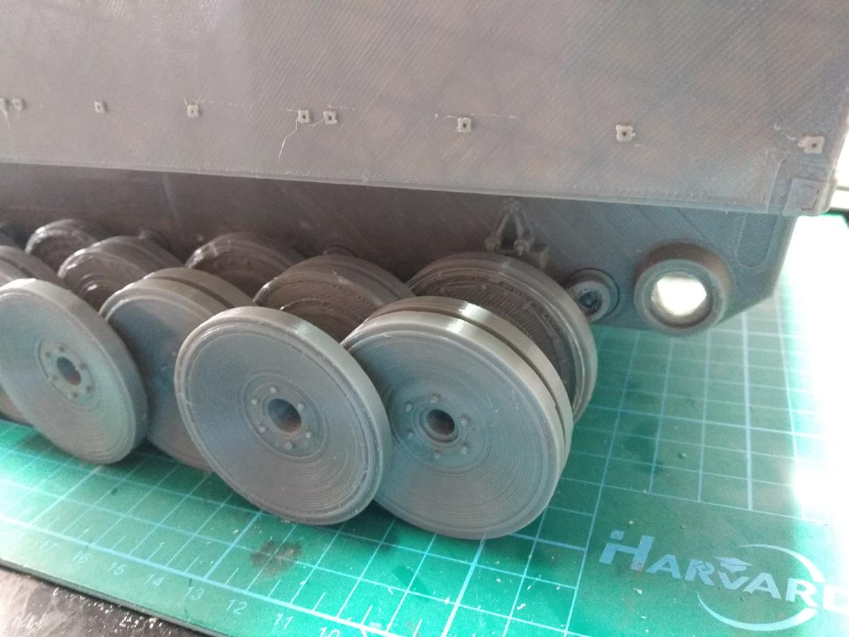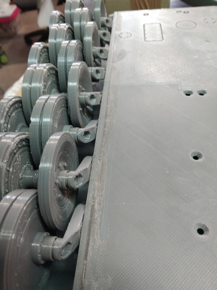 Finalmente, después de muchas pruebas, decidí juntarlas de forma que cada set, se compusiera de dos piezas, una las ruedas dobles y otra la rueda simple. la cara con mas calidad de la impresión es la que queda interior y exterior del set, ya que la parte que va dentro de la cadena apenas se ve. Así habrán dos tipos diferentes de sets, por lo tanto 4 piezas diferentes a imprimir, con un total de 16 sets, 8 para cada lado del Tigre.
