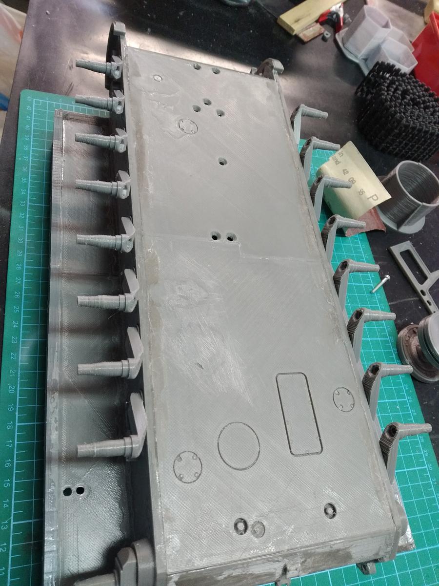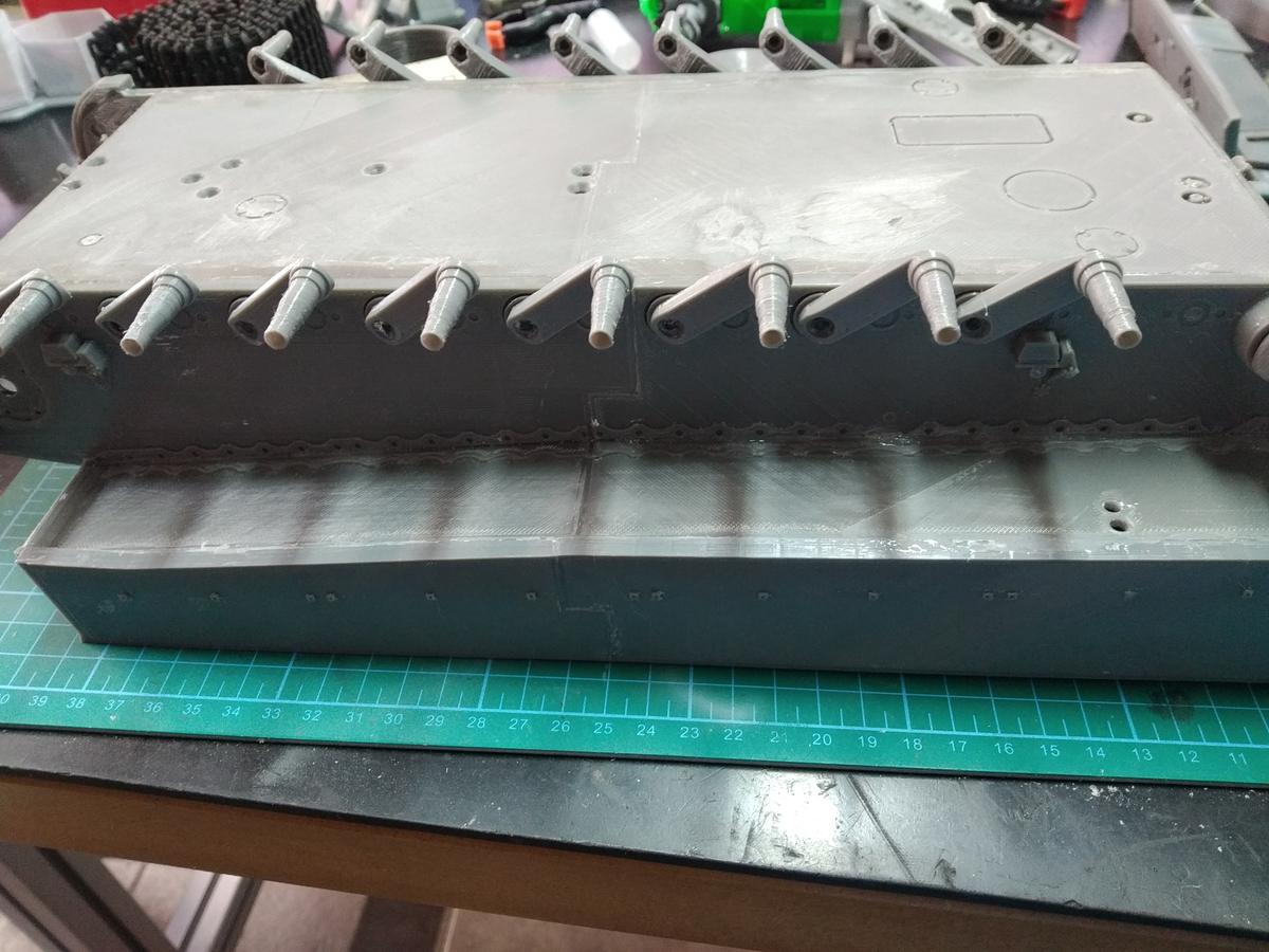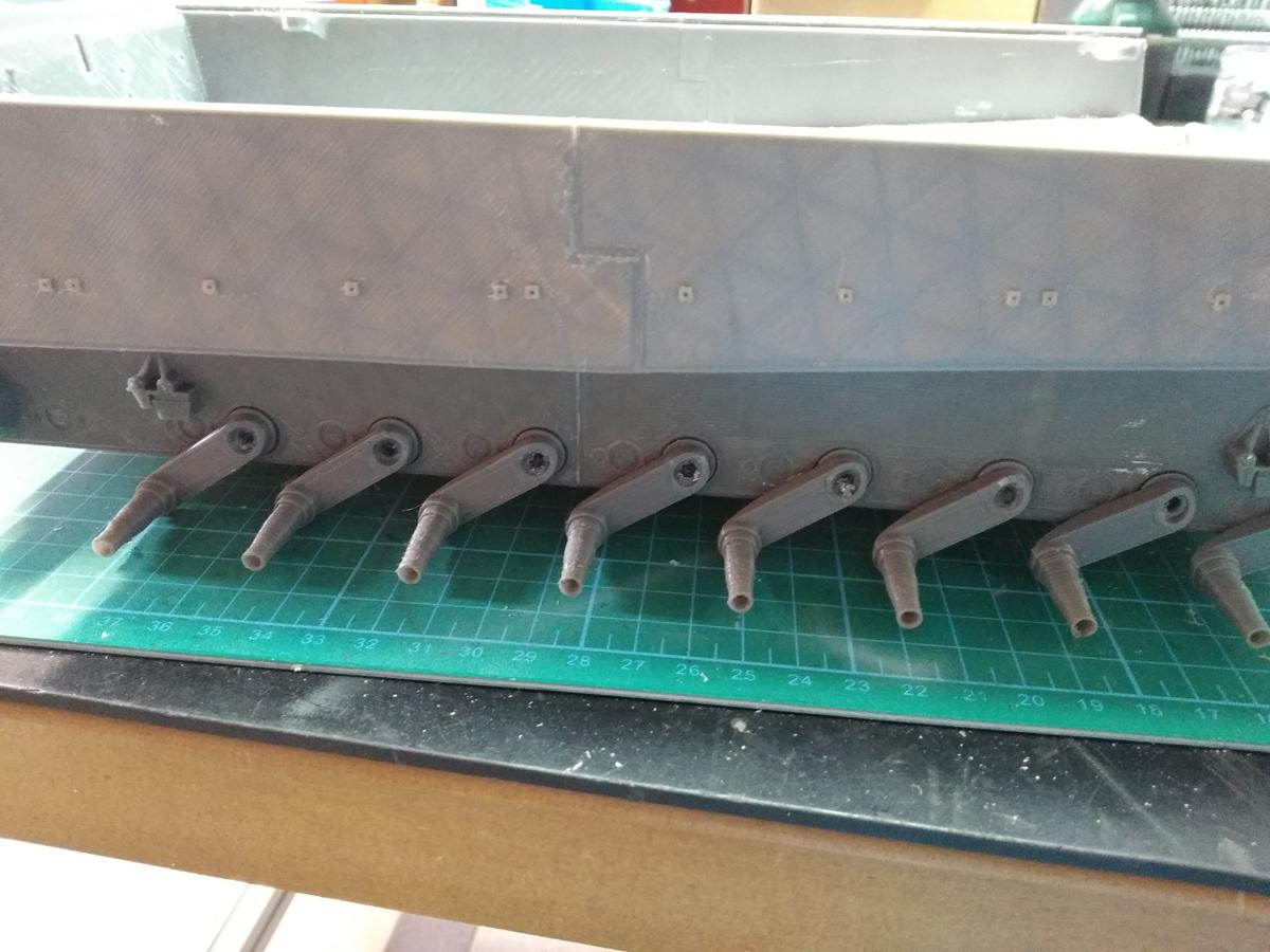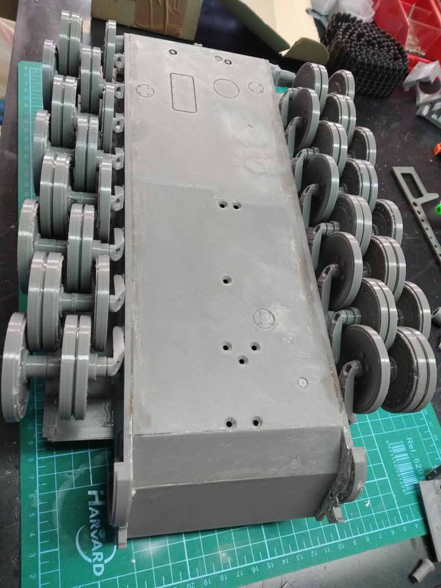 Finalmente, después de muchas pruebas, decidí juntarlas de forma que cada set, se compusiera de dos piezas, una las ruedas dobles y otra la rueda simple. la cara con mas calidad de la impresión es la que queda interior y exterior del set, ya que la parte que va dentro de la cadena apenas se ve. Así habrán dos tipos diferentes de sets, por lo tanto 4 piezas diferentes a imprimir, con un total de 16 sets, 8 para cada lado del Tigre.