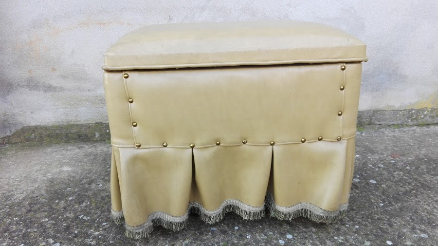 REPOSAPIES ANTIGUO: Cuando me lo dieron, estaba en un estado horrible, el tapizado era de aquellos de terciopelo verde antiguo, con flores grandes en granate, no se pudo salvar nada, excepto la estruc ...