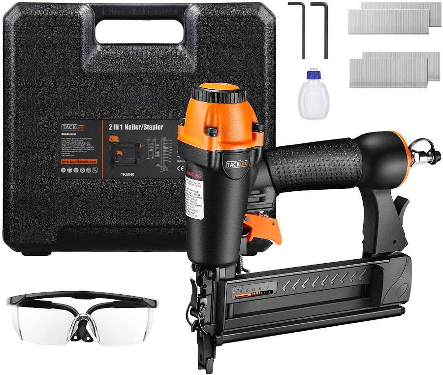 Clavadora neumática muy versátil y la más vendida entre los usuarios de bricolaje. Muy ligera y versátil ya que acepta tanto clavos Brad como grapas. Fáciles de encontrar en tiendas de bricolaje.Muy usada en trabajos caseros, sobre MDF, tapizados y manualidades. Con una buena presión, realiza acabados profesionales.