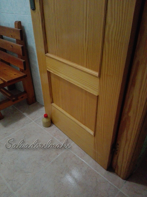 Una vez terminado se pone un fieltro adhesivo en la base para que no arañe el suelo y ya podemos usar nuestro tope que aguantará la puerta en su sitio y es fácil de desplazar con el pie cuando no se necesite.