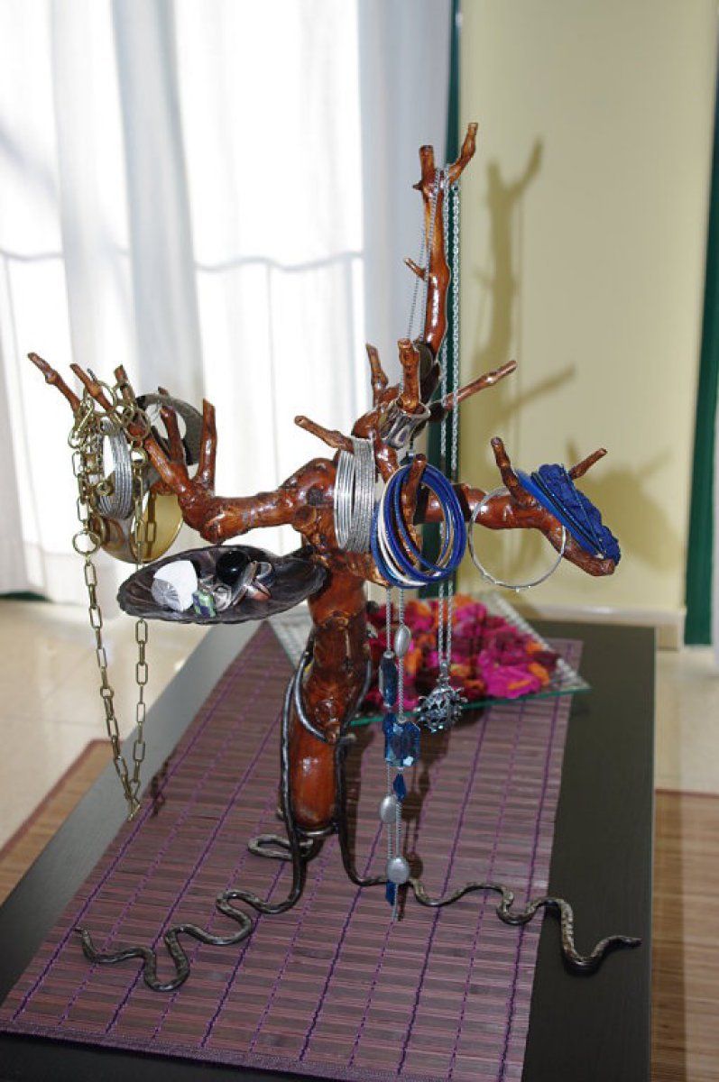 Nuestro amigo Chapucero es todo un experto en el trabajo con forja. Ejemplo de ellos son los diferentes trabajos que nos ha ido enseñando con este material. Así, por ejemplo, fabricó un bonito regalo para su hija combinando la forja con madera. En concreto, se trataba de un colgador para collares, pulseras.. Para ello utilizó unas ramas de vid, que mantuvo a partir de un soporte que fabricó él mismo en forja, además de otros detalles como la hoja, también de forja.Por otro lado, tenemos otro trabajo de Chapucero, un cabecero con mesillas a juego que fabricó a partir de diferentes adornos en hierro.